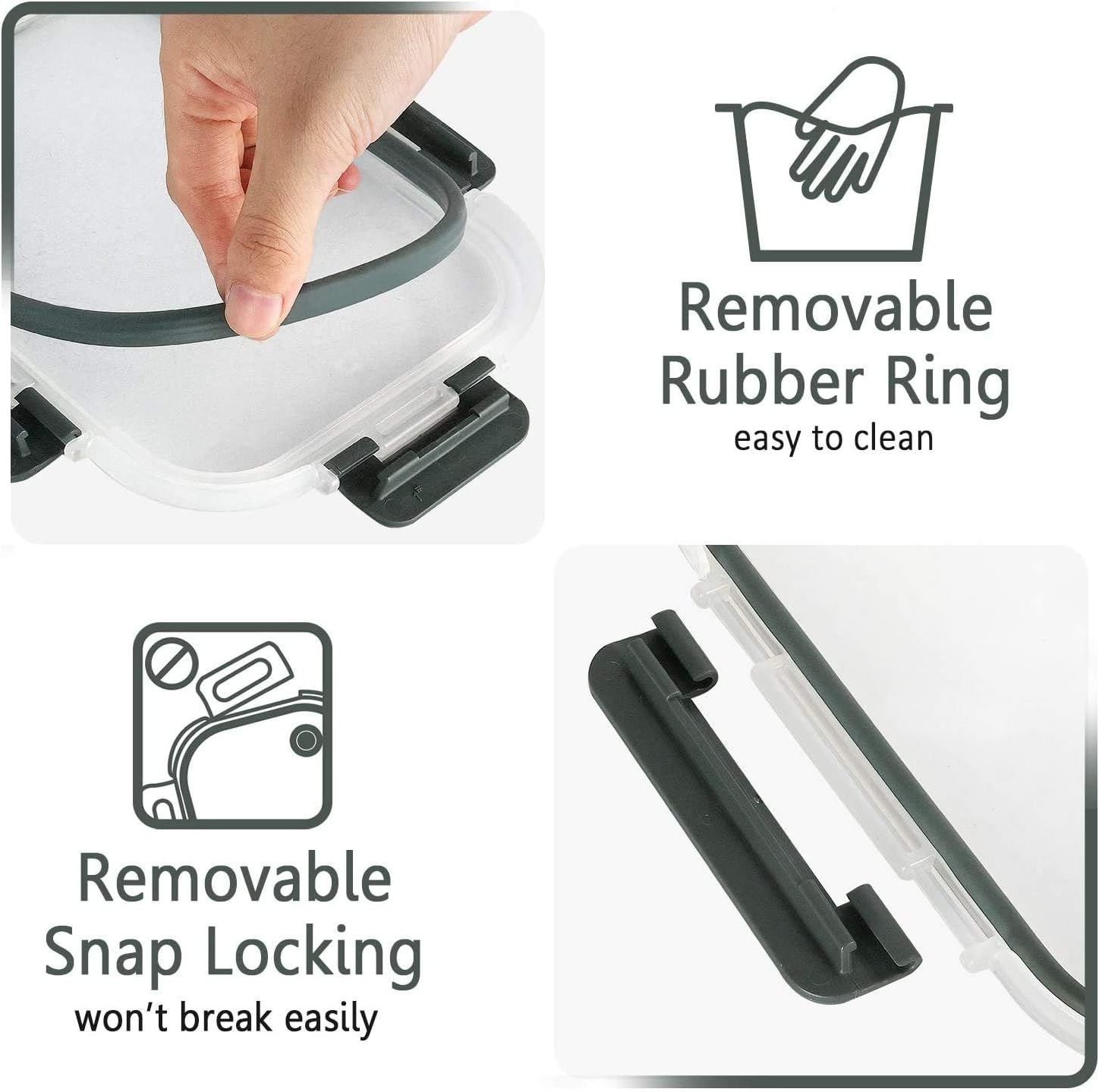 - AIRTIGHT GLASS STORAGE CONTAINERS: Snap locking lids with silicone gasket seals are designed to keep food fresh for longer periods. The silicone sealing ring is removable. Airtight closure make the glass storage containers spill free and greatly store liquids, such as soup and juice. Please remove the lids before putting the containers into oven, microwave and dishwasher for better maintenance.