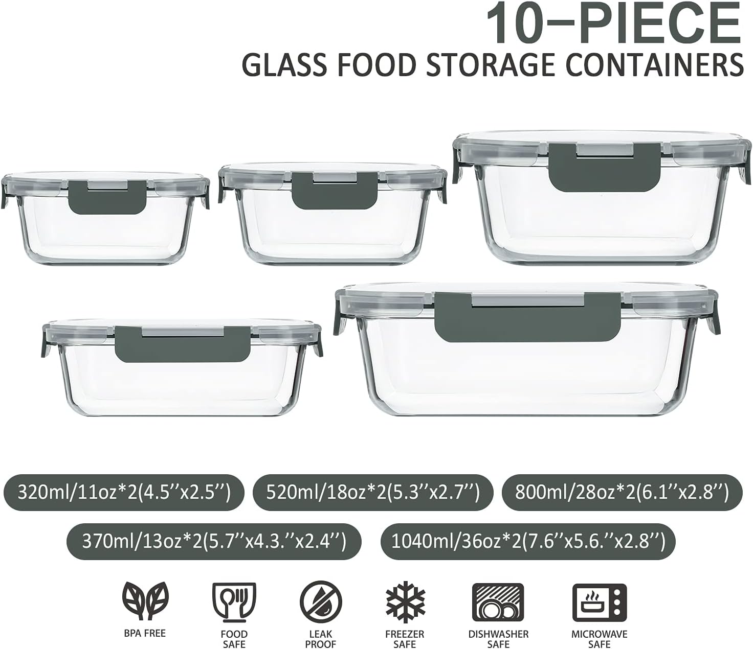 10-Pack Glass Food Storage Container with Lids, Airtight Glass Lunch Bento Boxes, Leak Proof Glass Meal Prep Container,Microwave, Oven, Freezer and Dishwasher Friendly