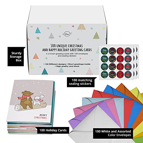 - 🎄ASSORTED COLOR ENVELOPES WITH MATCHING SEALING STICKERS: Our bulk christmas greeting cards set with envelopes come with 100 high quality, white and assorted color envelopes. Though they can be sealed without stickers, we’ve included 100 matching sealing stickers to add a special touch.