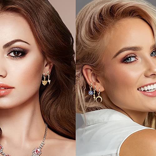 - 【12 pairs gold dangly Huggie earrings set】, they have a completely different style. For example: butterfly, cone, star and moon, devil's eye, leopard, lightning, cross, snake, love and so on. All kinds of elements to let you have more collocation.