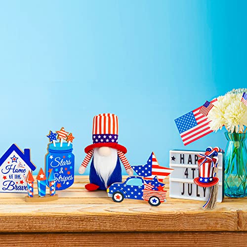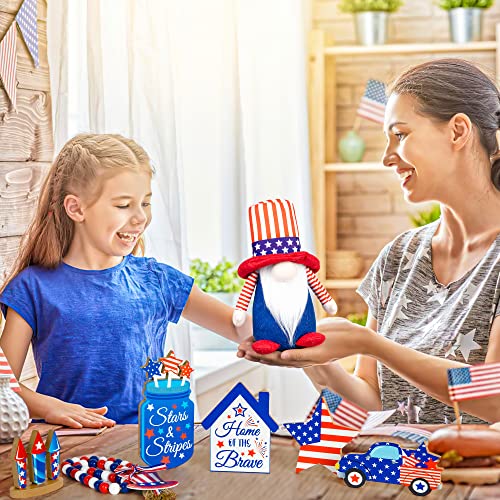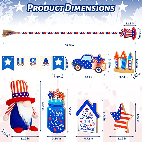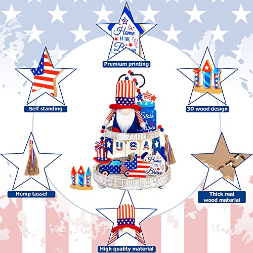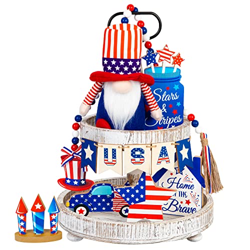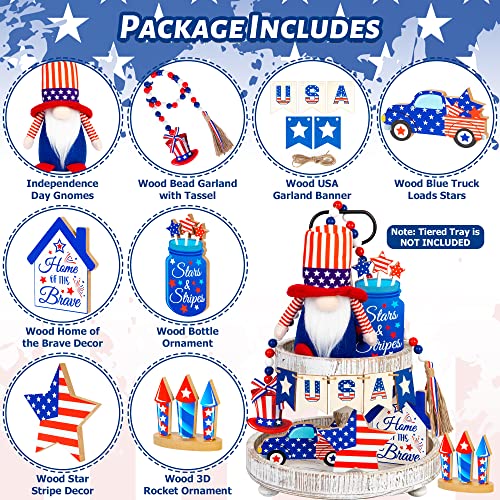 - Value Decor Set - The package comes with 1 cute Independence Day gnomes, 5 tray wood sign decors with different classic design, 1 bead garland with tassel and 5 USA flag banner cards. Enough ornaments to satisfy your decoration needs. (TIERED TRAY IS NOT INCLUDED)