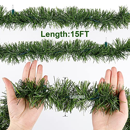 - Lighted Christmas Green Garland: Christmas artificial pine garland with 35 count clear incandescent mini string lights, the length of the Christmas wreath and the string light are 15 feet long, and it can not be connectable. This soft lighted Christmas green wreath can be combined with a string of lights or worn alone.