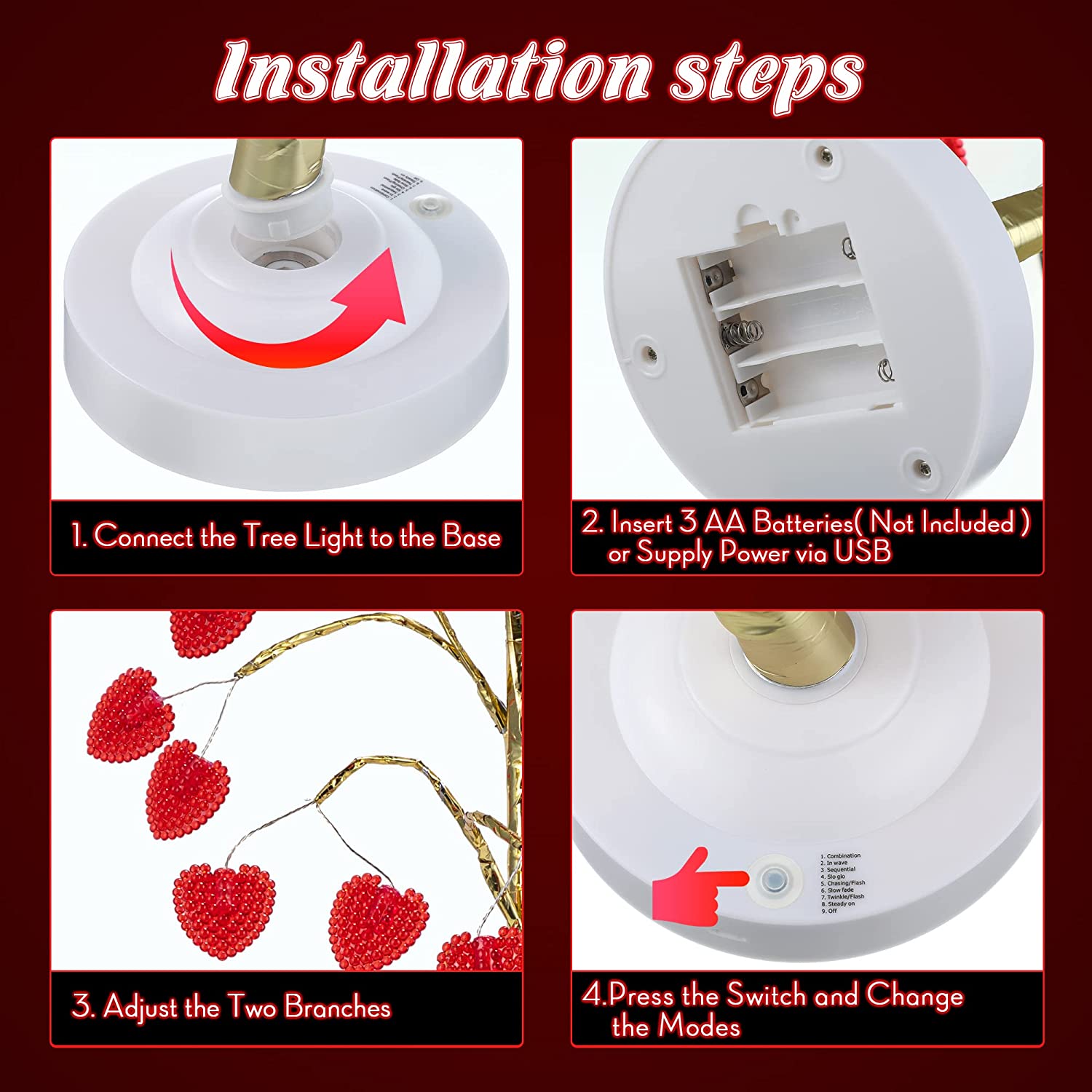 - 💖【8 Lighting Modes Changing】How could a Valentine's Day decoration be without lighting, the tree light has 8 lighting modes that can be freely switched, such as combination, in wave, sequential, slo glo and so on, enable you to create different atmospheres that you desire; Making it a great add-on for your Valentine's party, anniversary, wedding, proposal, confession, the romantic night