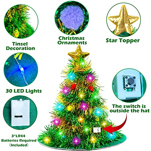 - [ 30 LED Colorful Lights & 3 Lighting Modes ] Each Christmas Tree Hat has built-in 30 LED colorful lights with 3 modes(fast flash, slow flash and steady on). Lighting colors: yellow, blue, red and green.