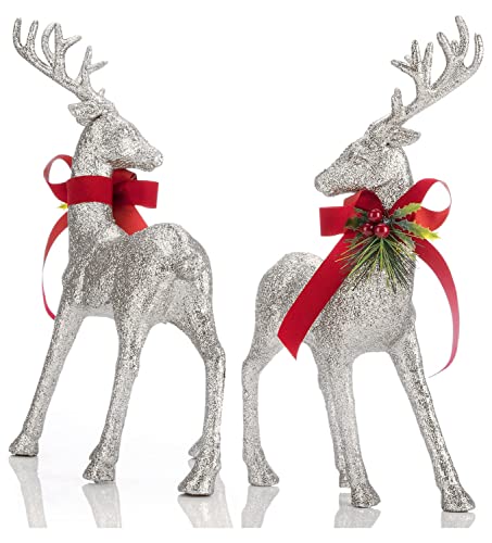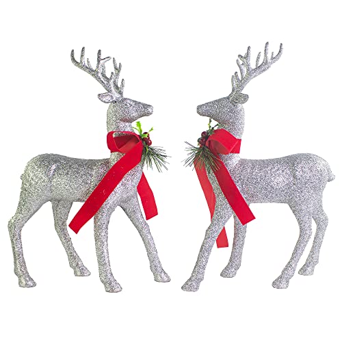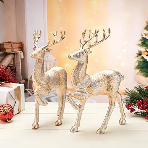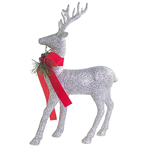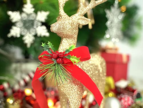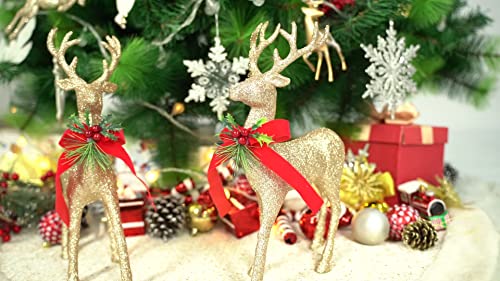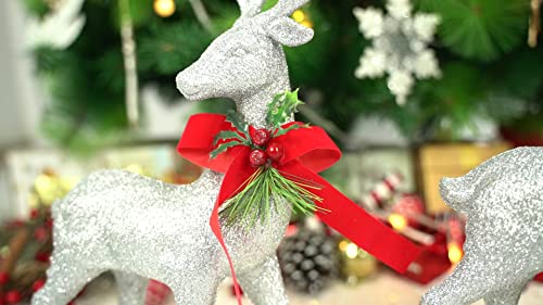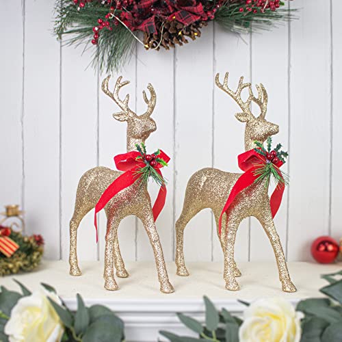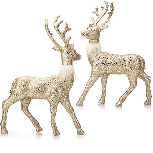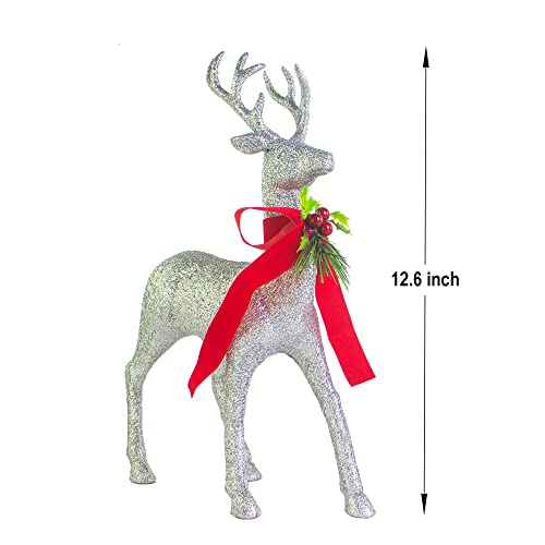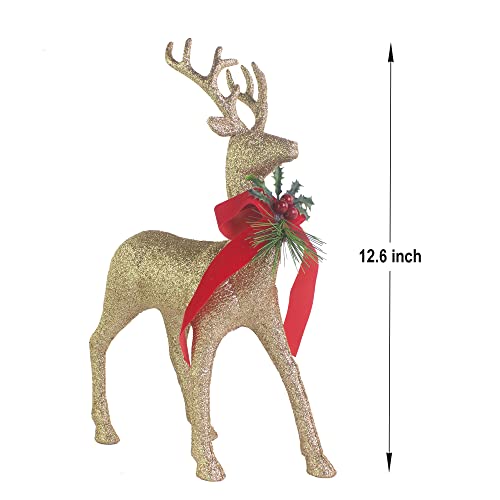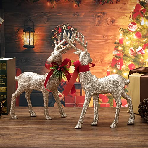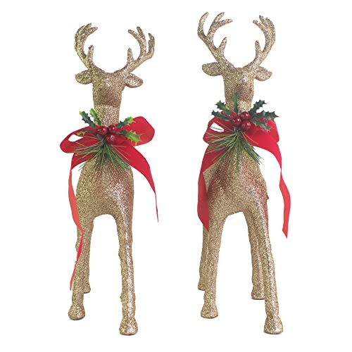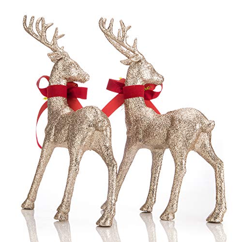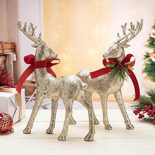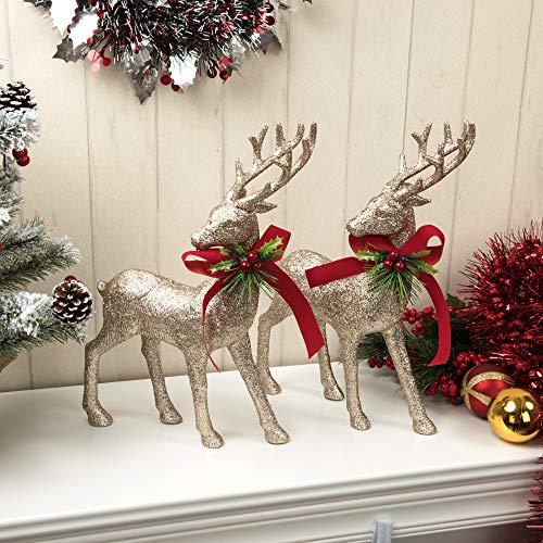 - This set of adorable glitter Champagne statues with two standing deers, look gorgeous in a winter scene with greenery and lights. It wears a red bow-knot with pine branches and red berries.