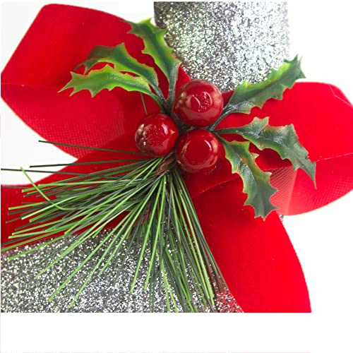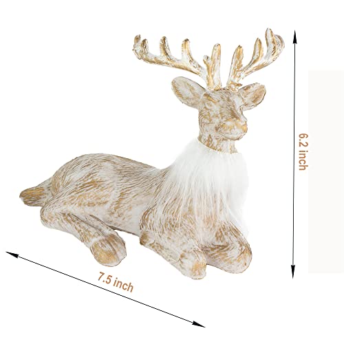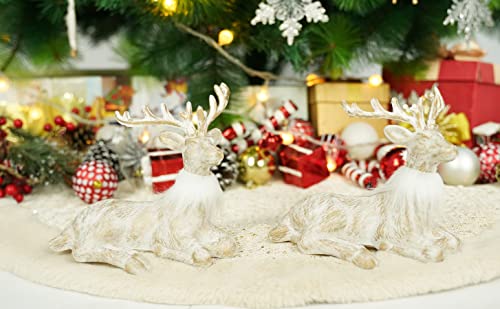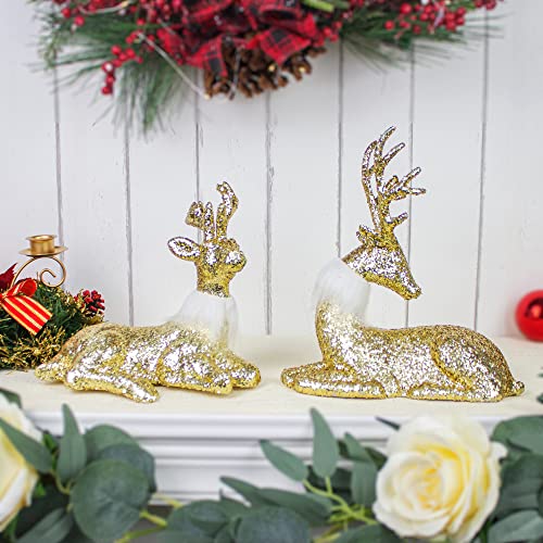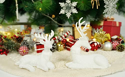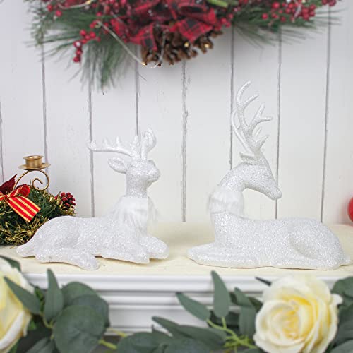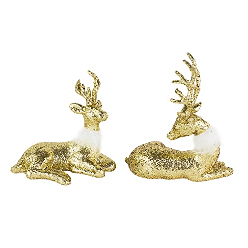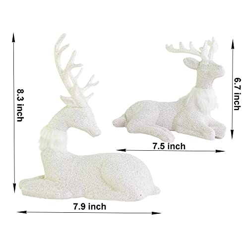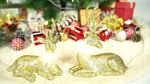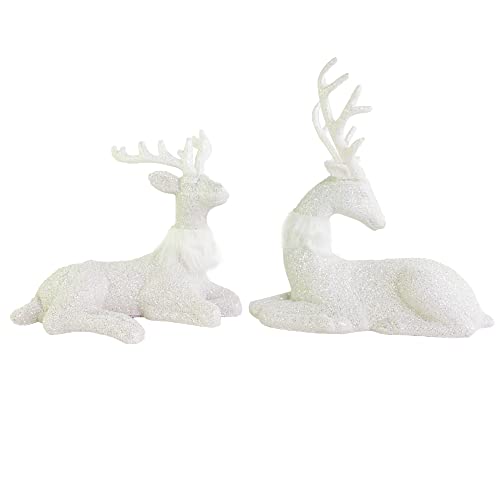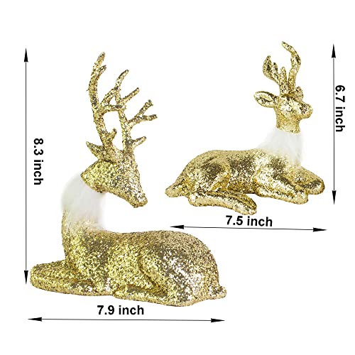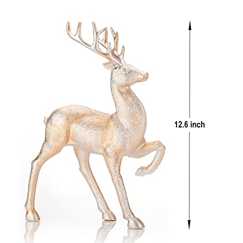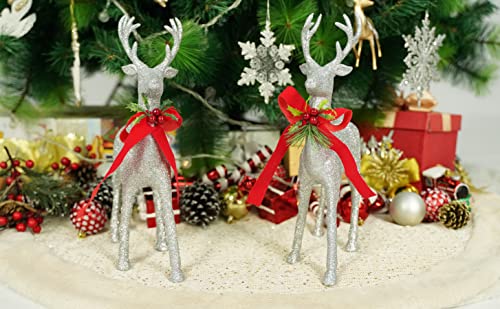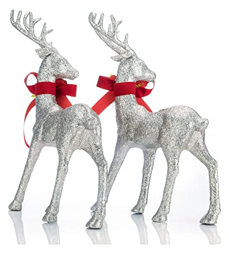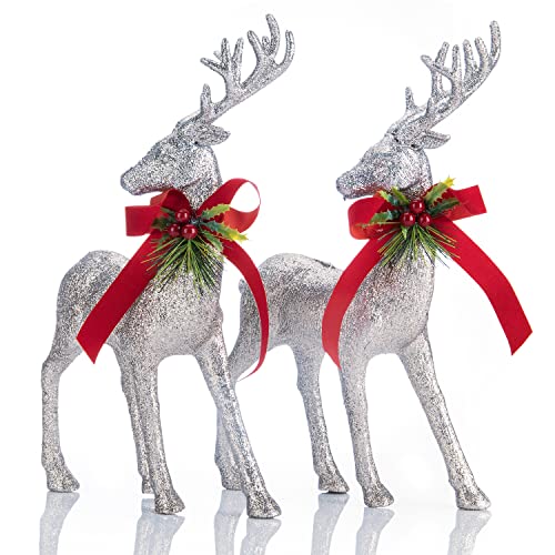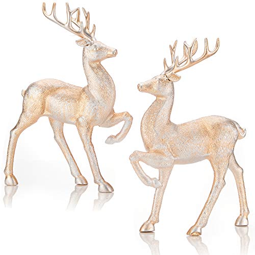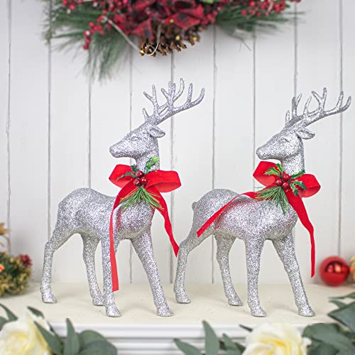 - This set of adorable glitter Champagne statues with two standing deers, look gorgeous in a winter scene with greenery and lights. It wears a red bow-knot with pine branches and red berries.