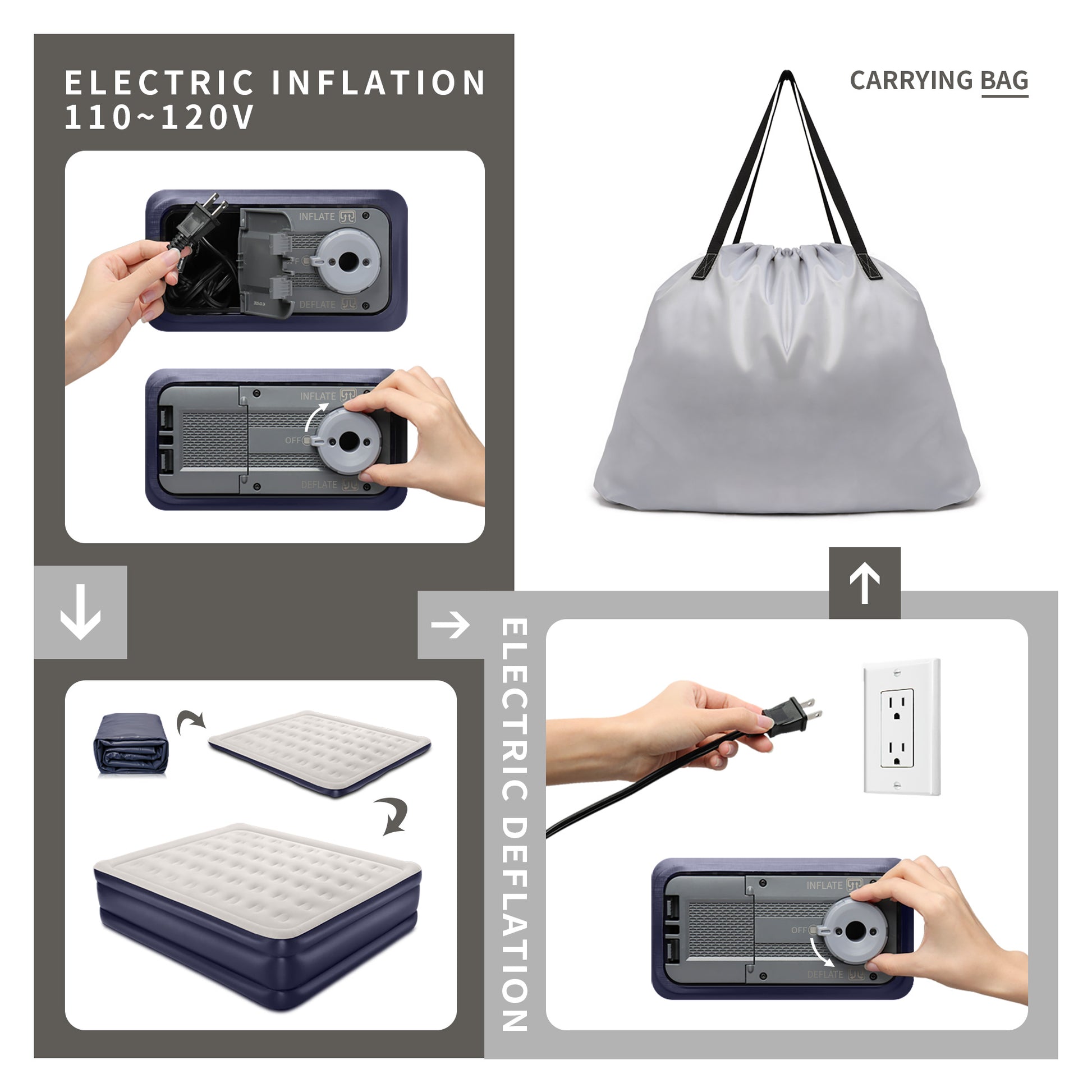 - An assisting, electrical, built-in pump makes for easy inflation and deflation in 3-5 minutes. Once you don't need the air mattress anymore, you can pack and store it on your own, without any extra help.