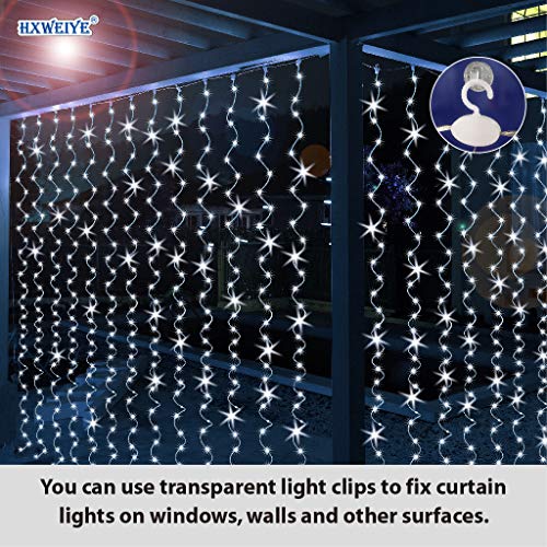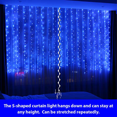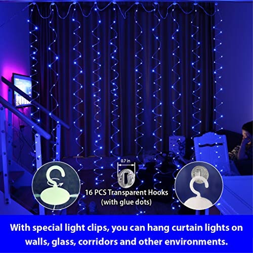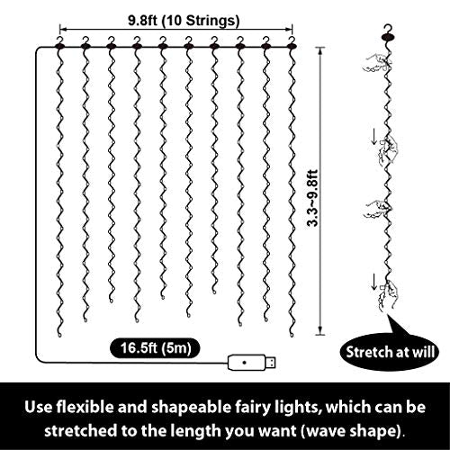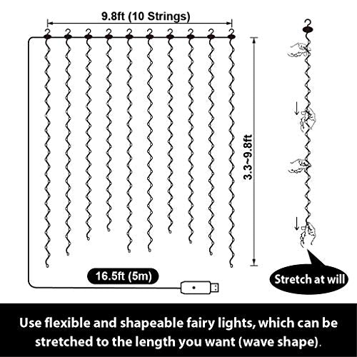 - · 【16.5ft Lead wire】: 300 individual LEDs, 9.8ft.x9.8ft curtains lights come with extra 16.5ft long power cord. 9.8ft main strand and 10 drop strings included hooks. Copper wire drop strings is tough & flexible, hanging & adjustable desired height naturally easily. No limits to your imagination, Do the shape you like. Enjoy a fairytale world ( Curtain is NOT included).