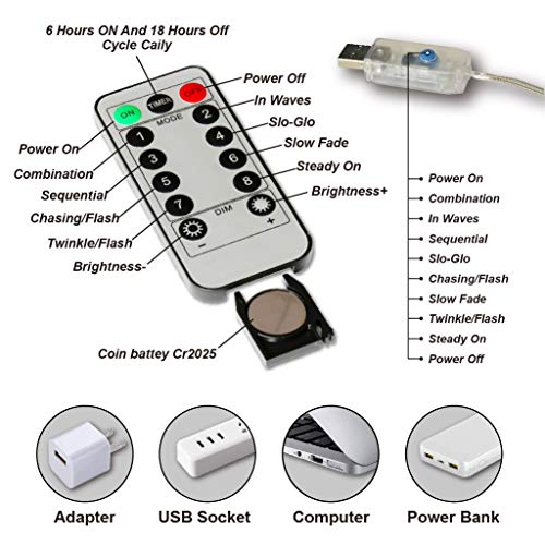 - · 【8 Light Settings & Timer Remote】: 8 different flash modes for choosing such as combination, in waves, sequential, slogs, chasing/flash, slow fade, twinkle/flash, and steady on controlled by wireless remote . 6 hours On and 18 hours Off automatically every 24hrs once TIMER activated. All is in your control.