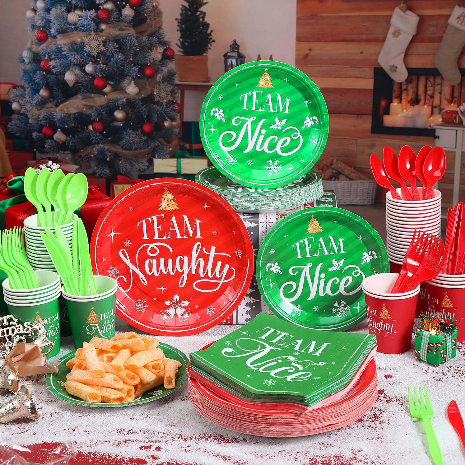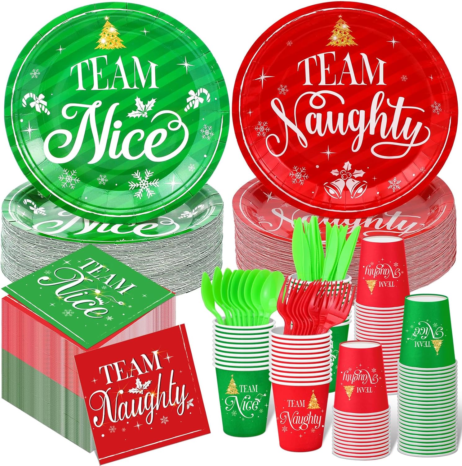 350 Pieces Christmas Disposable Dinnerware Set, Serves 50, Naughty or Nice Paper Plates Team Naughty Team Nice Napkins Cups Cutlery for Christmas Holiday