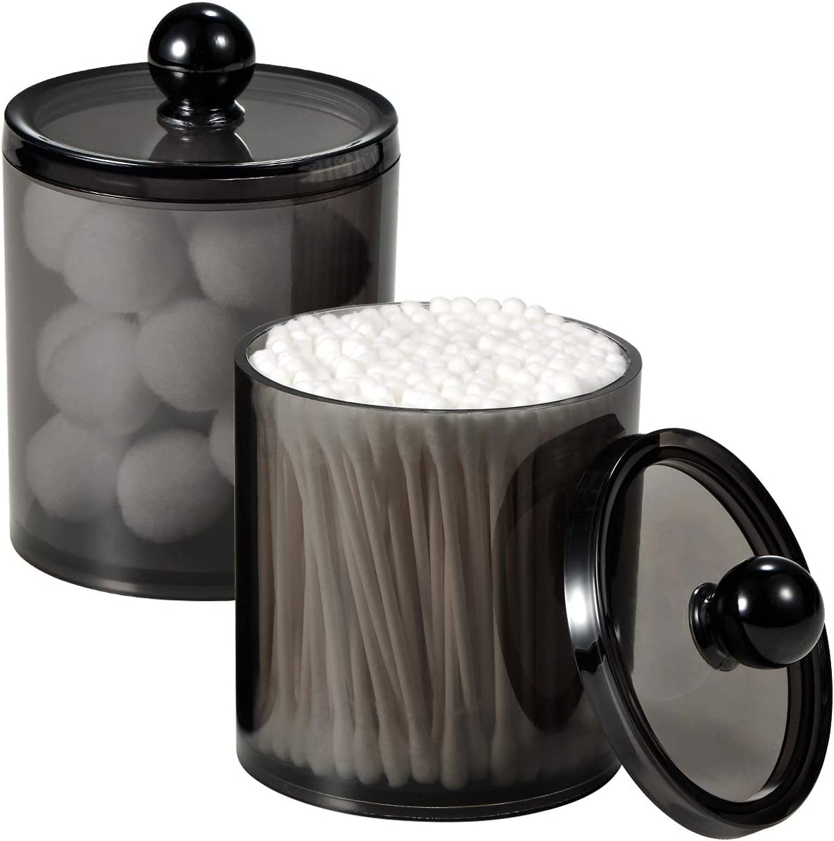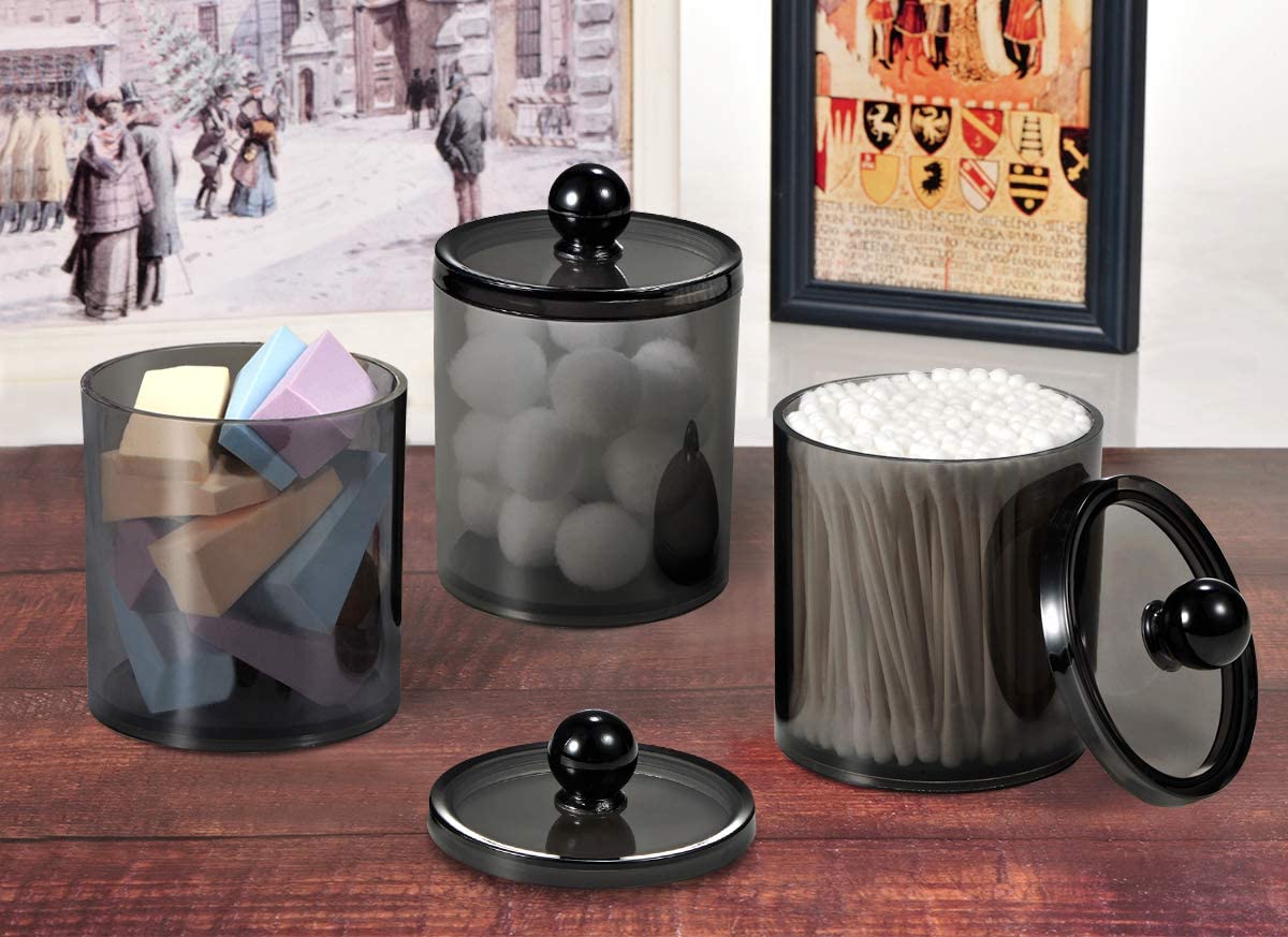 - ✅ CUTE AND FUNCTIONAL - The black acrylic apothecary jars combine BEAUTY with organization,going perfect for the modern farmhouse look you’re looking for in the bathroom. A rounded base provides plenty of room for storing bathroom essentials such as cotton swabs, qtips, cotton balls, cotton rounds, floss picks and is easily wiped clean with soap and water.Package includes:4 Pack of 15 ounce canisters