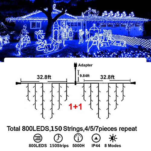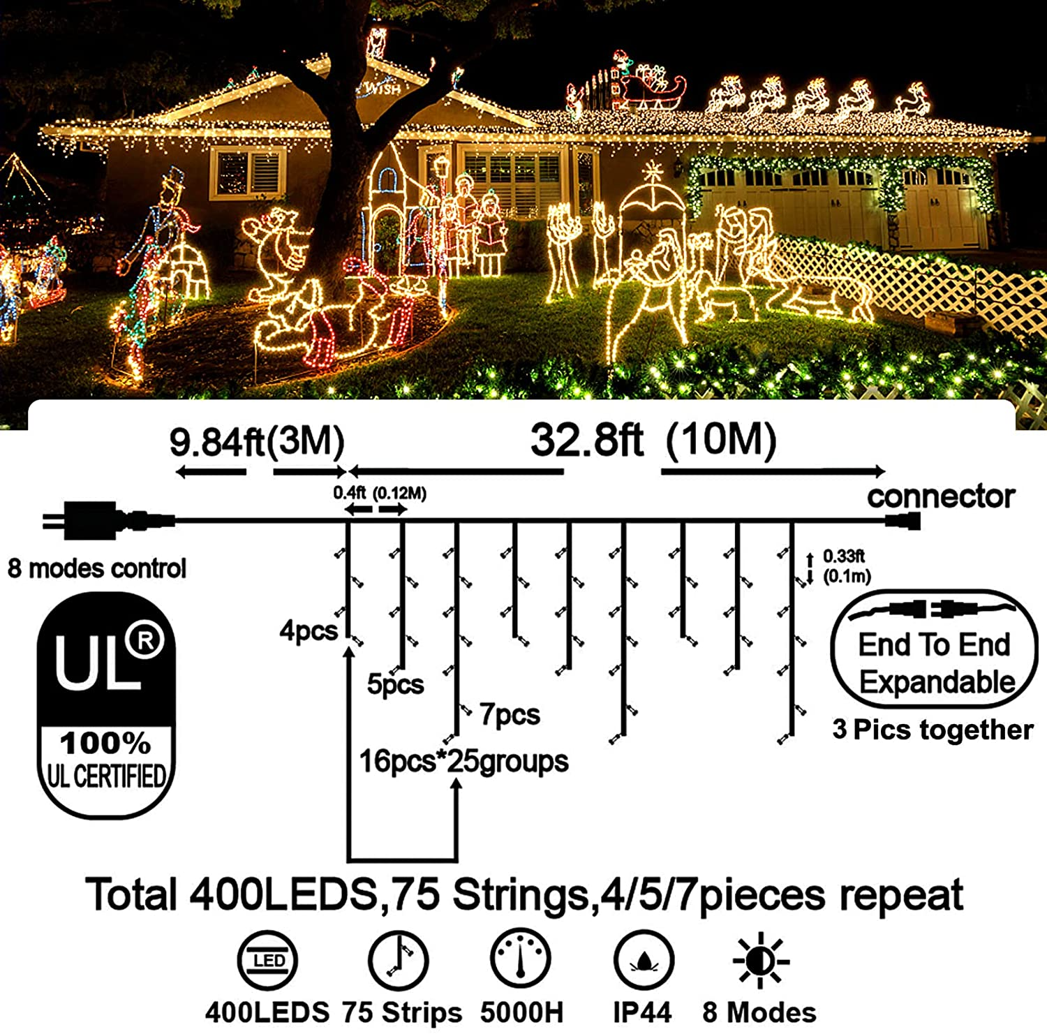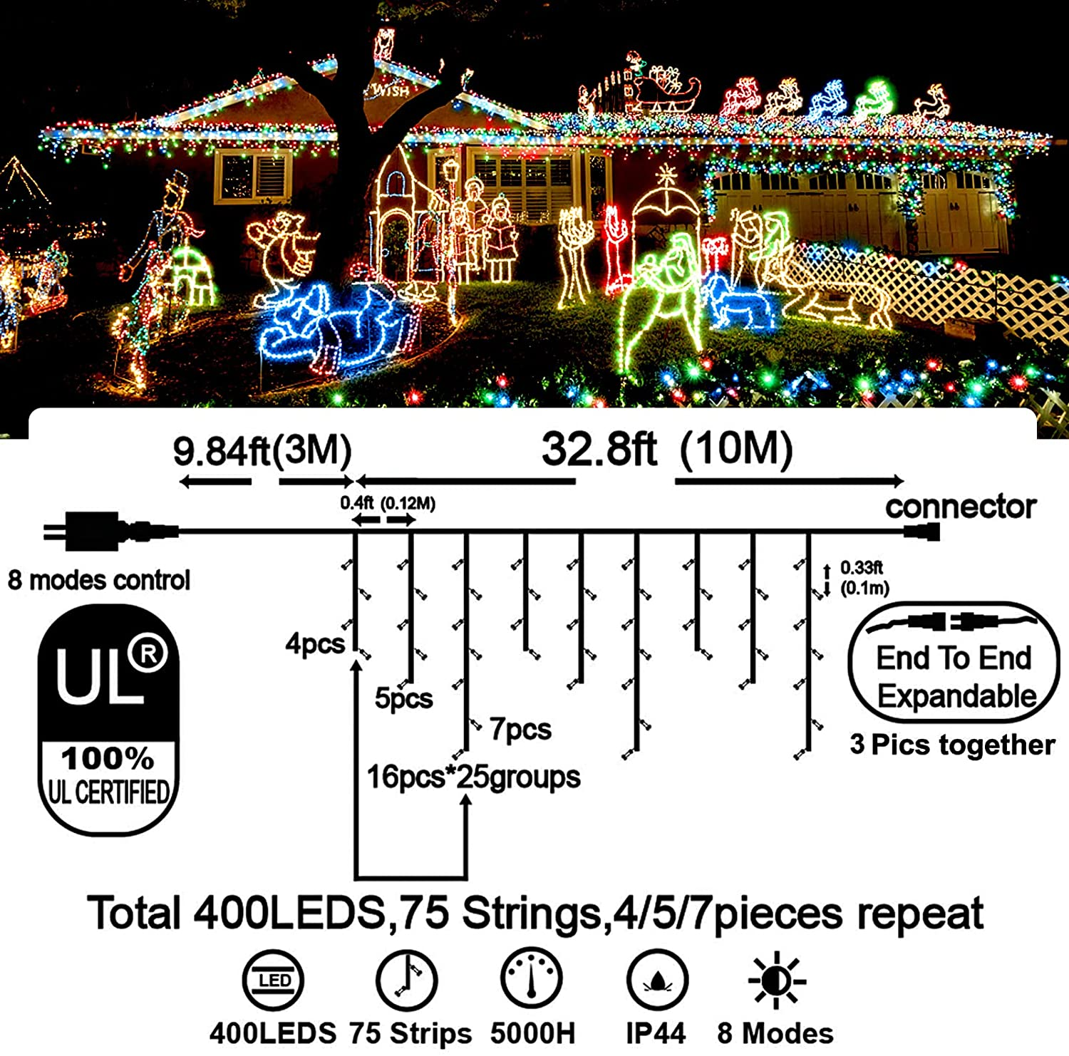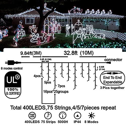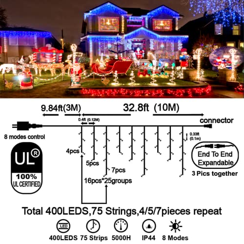 - Christmas Decoration Ice Lights: 400 pieces LED, 32 feet total length with 75 drops, with 4 / 5 / 7 led drops, up to 3 strands end to end extendable to customize your need for larger range lighting and festival decorations.