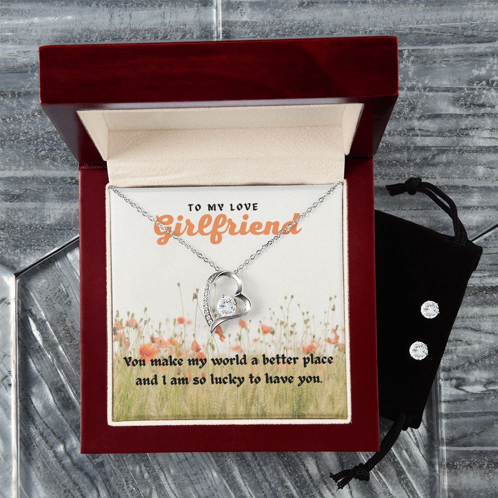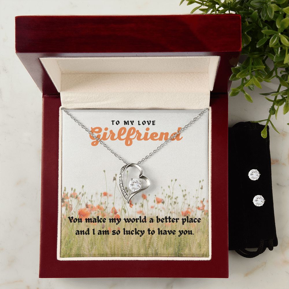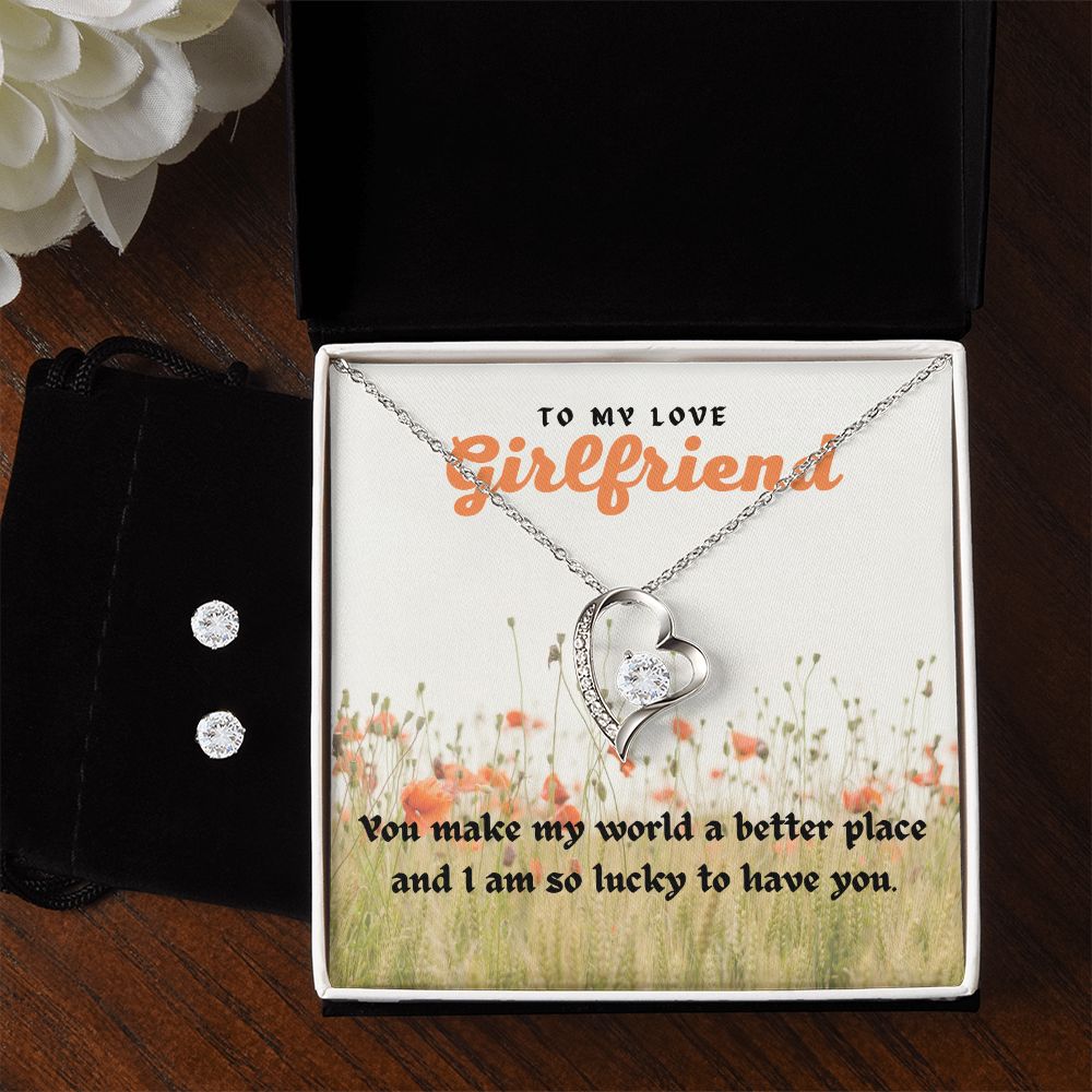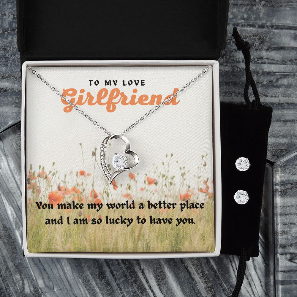 Give your loved one a gift that will make their heart swell! The Forever Love Necklace and Cubic Zirconia Earring Set is sure to do the trick. This necklace and earring pairing provides dazzling sparkle when worn together or separately, and is perfect for any occasion! Do not miss out on this special offering!