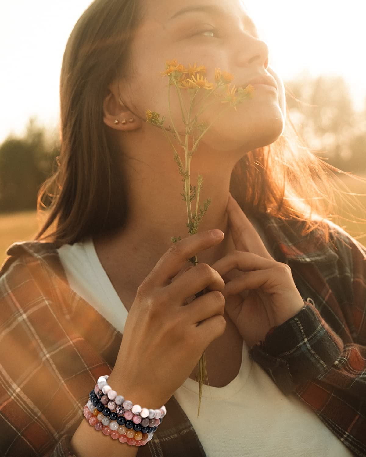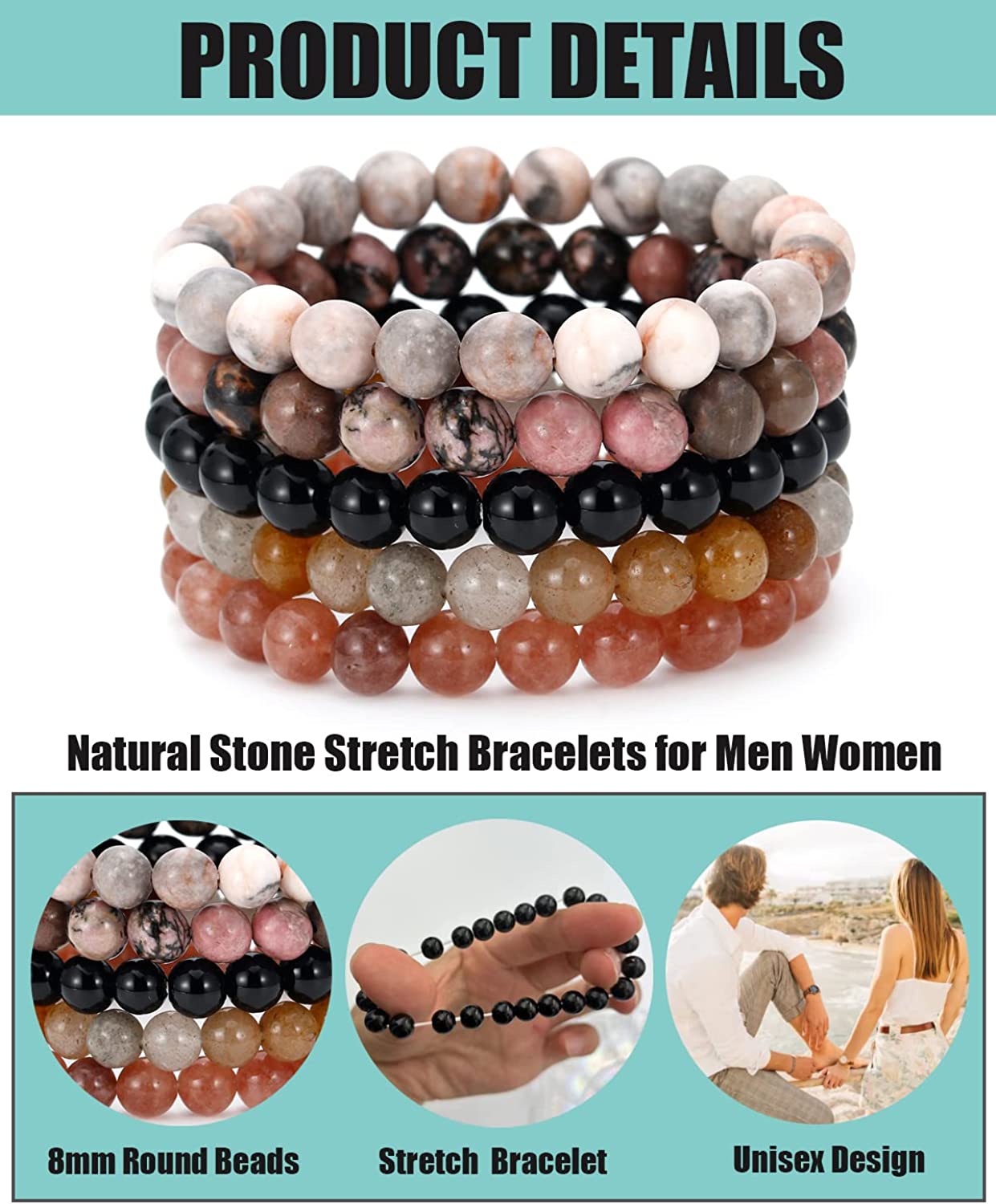 - 【Handmade Beaded Bracelets】-- These fashion beaded bracelets are made of hand selected 8mm round high quality beads and strong elastic rope.Excellent polishing make the stone beads are smooth and shiny.The quality stretch bracelet string, long time to use.No metal, good for sensitive skin.All gemstones are unique, therefore the color and pattern may vary from the picture shown but we know you will be pleased the uniqueness of your bracelet.