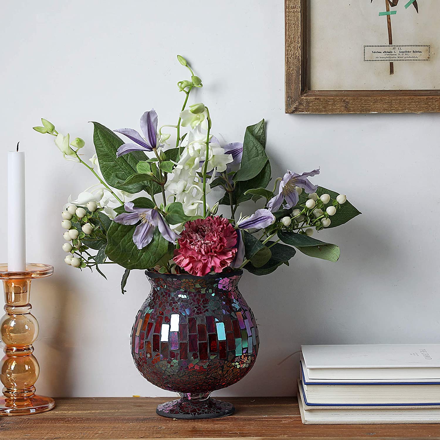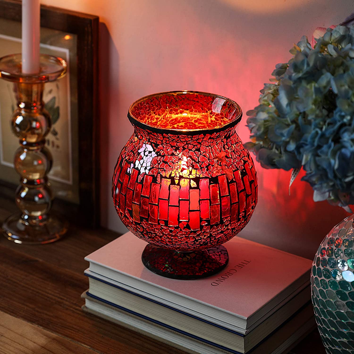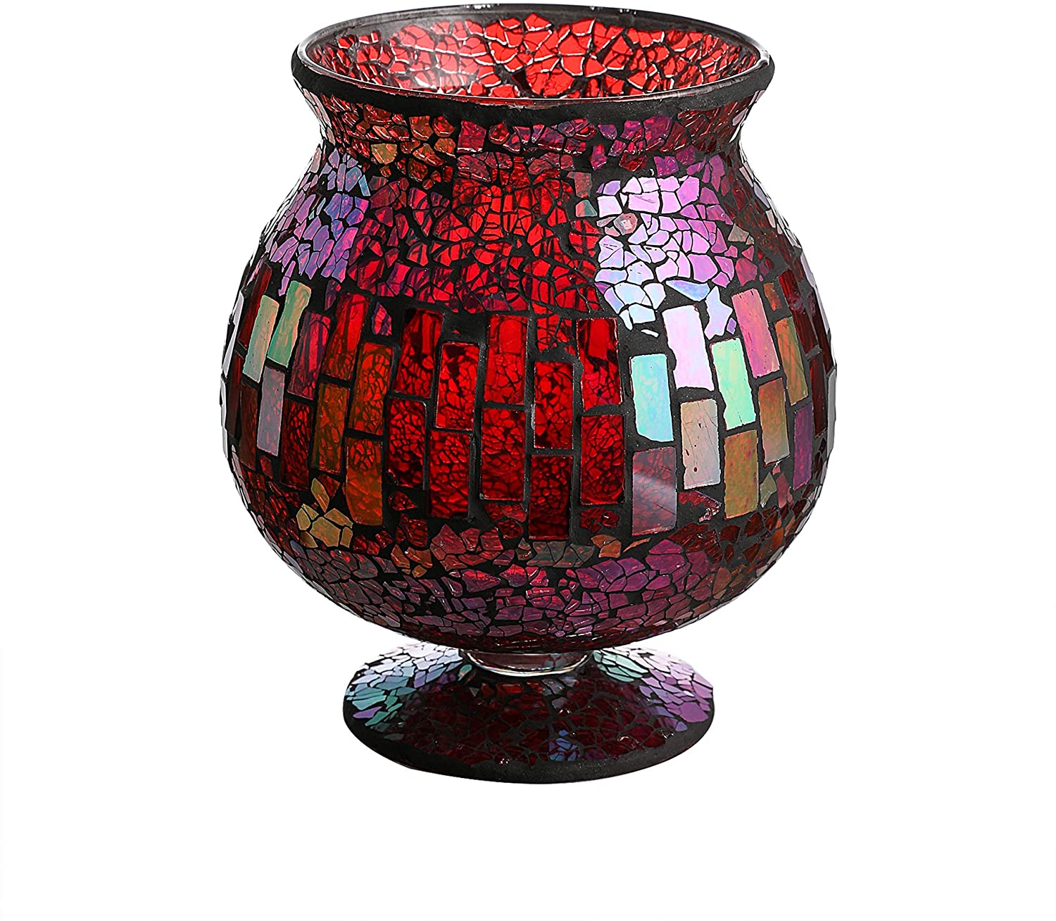 Housewares white mosaic glass hurricane can be a unique candle holder in the night, also can be a very nice vase. This glass hurricane takes on a warm glow when you put a candle in it. Add a gorgeous feel to your home by holding dry floral in this white vase. This candle holder is a must-have accessory for your home. It is also great for home decoration and gifts. 6.5 X 7 Inches Mosaic Glass Hurricane,Mosaic Glass Vase for Gifts & Home Decoration (Red)