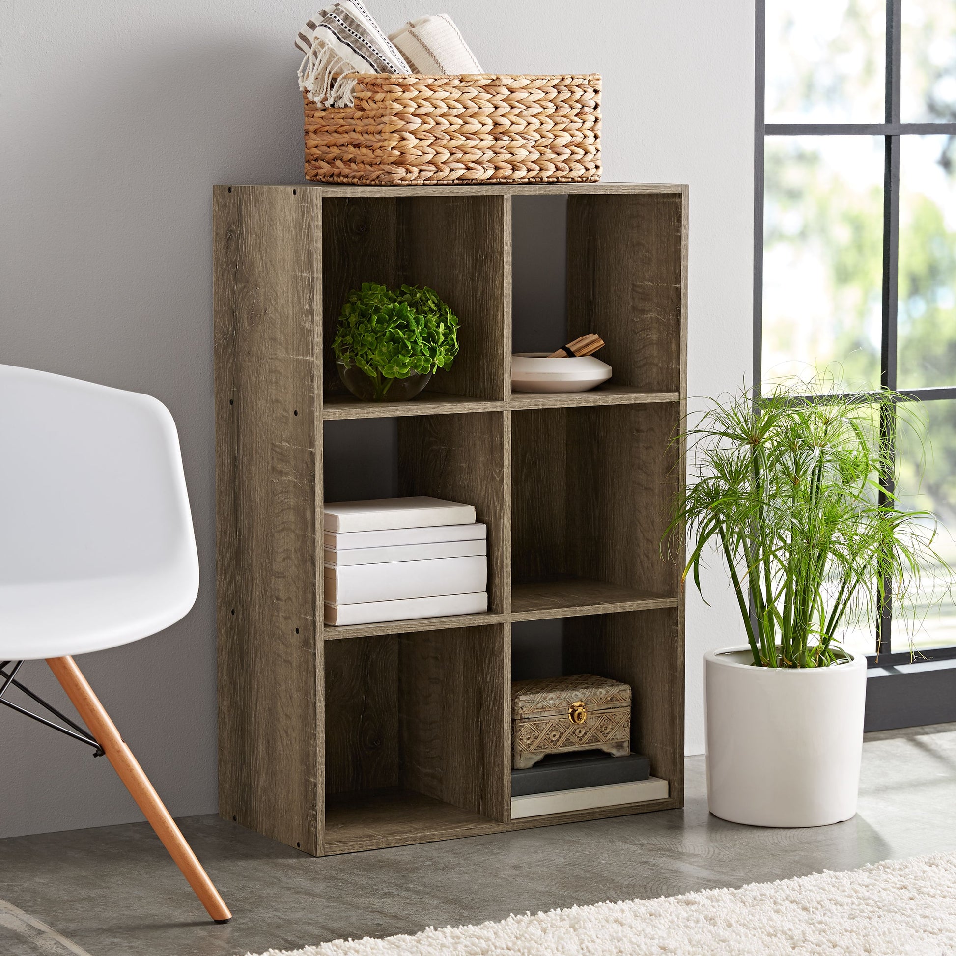 6-Cube Storage Organizers feature compartments that are perfectly sized for displaying books, collectibles, photography, artwork, and more. The stylish design includes three open-back cube compartments that make managing cords easy, and three closed-back compartment to keep displayed items securely housed. The top panel and middle shelves can each support up to 22 pounds, and bottom panel can support up to 33 pounds. This easy to assemble storage shelf is available in multiple finishes to fit in with almost any decor. Add an accent piece that is as functional as it is fashionable to your living room, family room, den, home office, and more, with the Mainstays 6-Cube Storage Organizer. Mainstays 6-Cube Storage Organizer, Canyon Walnut *- Stylish cube organizer bookcase *- Features six 11" x 11" x 11" storage compartments *- Designed with 3 open-back cubes and 3 closed-back cubes *- Top panel and two middle shelves each support up to 22 lbs, bottom panel supports up to 33 lbs *- Compatible with Mainstays 10.5" x 10.5" collapsible storage bins (sold separately) *- Dimensions: 23.7" W x 11.73" D x 35.39" H *- Weight: 32.5 lbs *- Materials: 98% particleboard, 1% paperboard, 1% zinc alloy *- Finishes available: Canyon Walnut (MS18-D1-1009-49), Rustic Brown (MS18-D1-1009-48), White (MS52002021002WH) and Black (MS52002021002BK) *- Includes wall attachment system for safety *- Easy to assemble with included instructions and video assembly guide (link below) *- Tools required: hammer, Phillips head screwdriver *- Package dimensions: 39.53" x 4.17" x 15.28" *- Package weight: 32.81 lbs Assembly