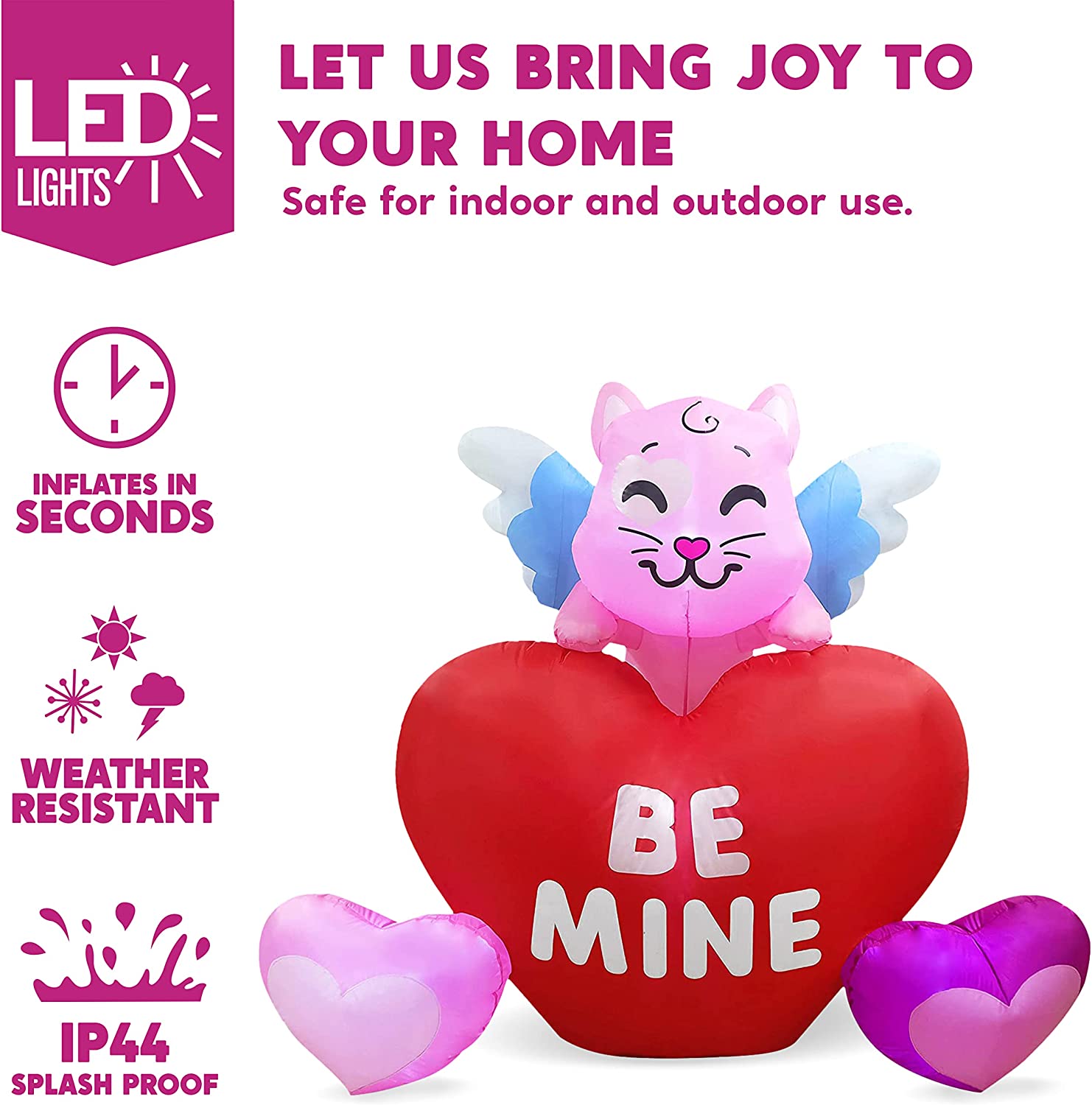 - 6 feet Long 5 FT Tall Kitty on Hearts Valentine Inflatable Decoration comes with extended cords, ground stakes, fastened ropes, built-in sandbags, built-in LED lights and a plug with UL certification.