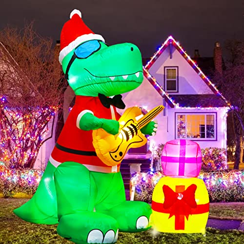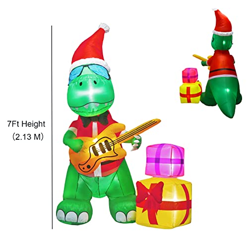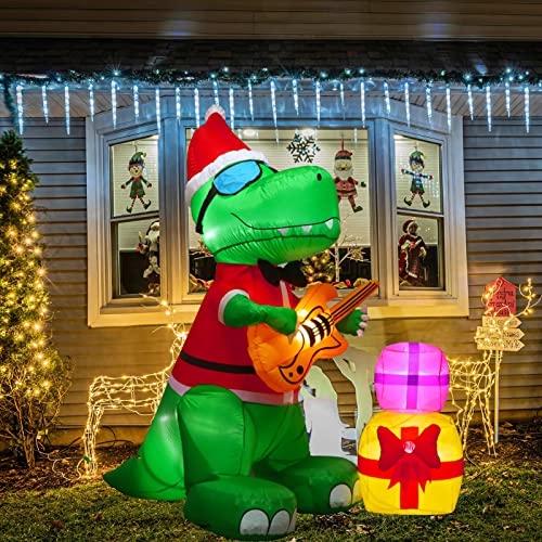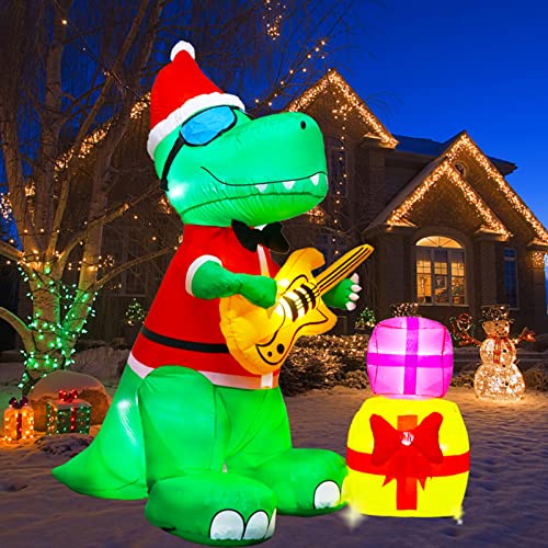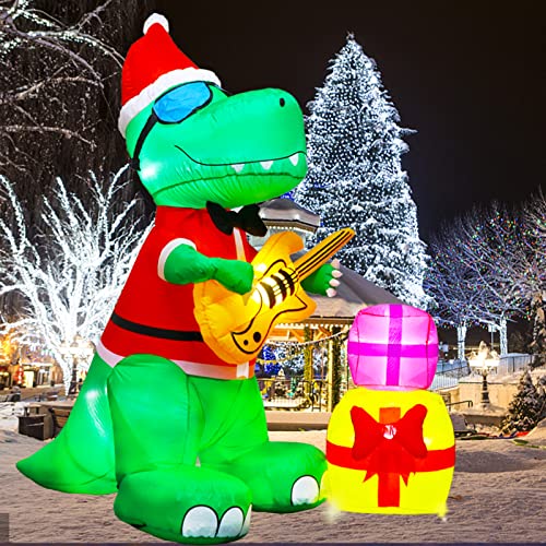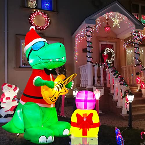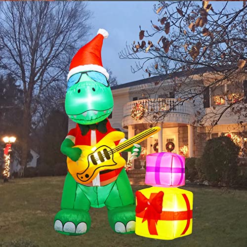 - UNIQUE CHRISTMAS INFLATABLE DINOSAUR: The cute Christmas inflatable is designed with a huge dinosaur with cool sunglasses, a guitar in his hand, and two gift boxes at his feet. This unique design looks like he was sending Christmas greetings to everyone, attracting Christmas atmosphere.
