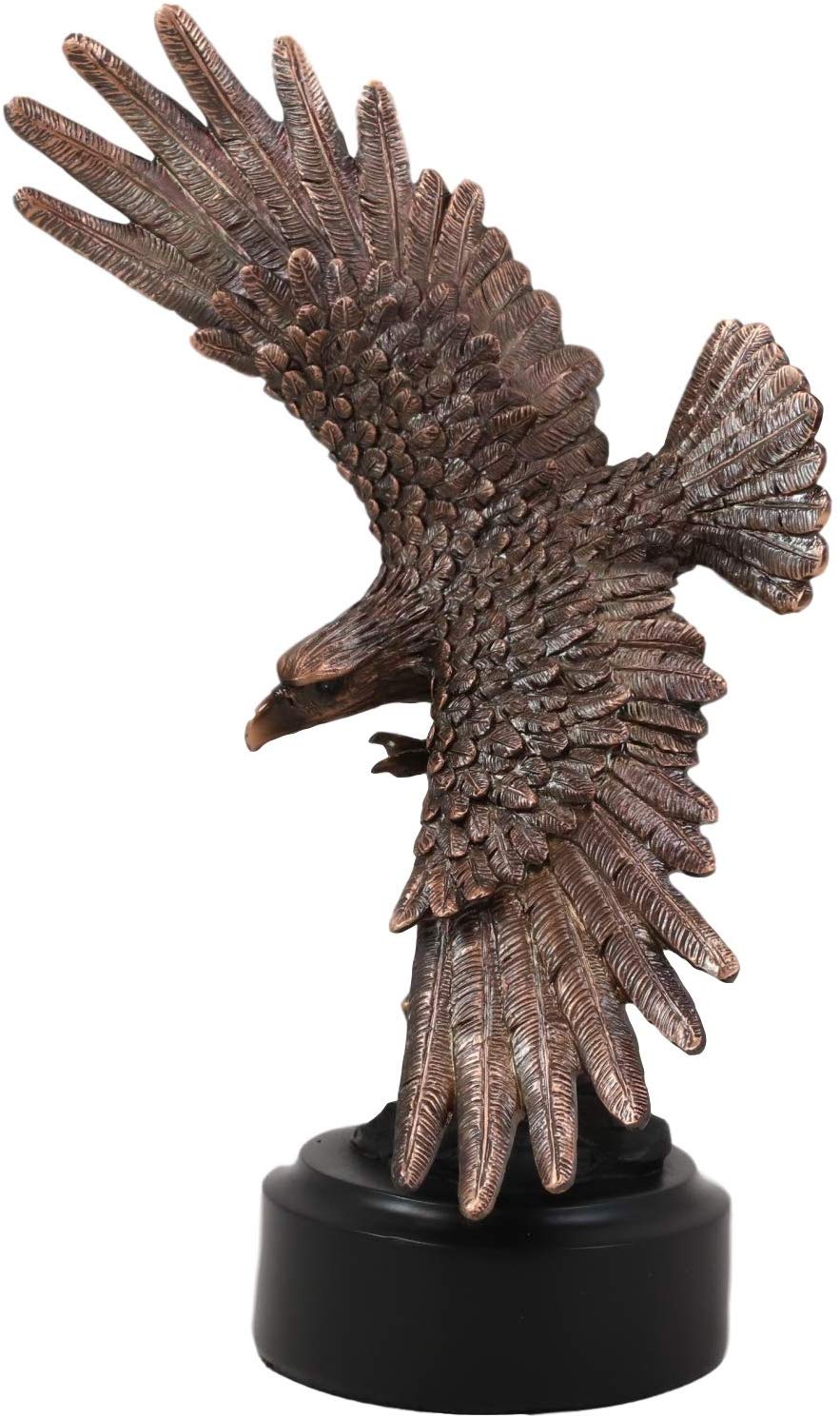 • This Beautiful Broad Winged Bald Eagle Swooping Statue is made of the highest quality resin, undergoing the process of bronze electroplating giving it a uniform shine on the inside as well as the surface of the figurine. This process makes the figurine resemble the look of actual bronze but with much lesser weight.This figurine is designed with a matching base to beautifully decorate your office, home and space. • This Beautiful Broad Winged Bald Eagle Swooping Statue measures 9.25" High 5" Wide and 4.5" Deep. The sculpture weighs 1.5 pounds. • The Bald Eagle is a symbol of long life, great strength and majesty. Upheld for generations as the image of freedom, the American Bald Eagle comes to life in this impressive, finely detailed statue. Add style and patriotism to the table, bookshelf or desk with this unique sculpture. 9.25" Tall Wings of Glory Swooping Broad Winged Bald Eagle