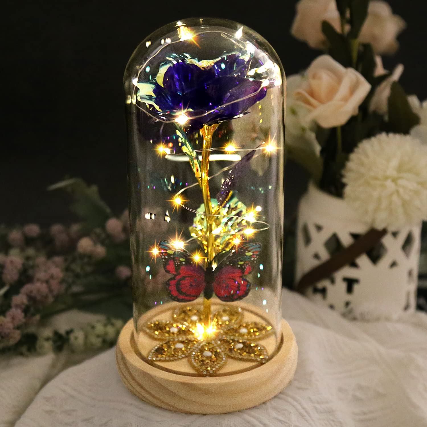 - 🌹【LIGHT UP ROSE IN GLASS DOME】-Crystal roses with butterfly are protected by a tough glass dome. The twinkle lights wrapped around the rose in glass dome. Everyone is fascinated with it when it's lit up. The rose under the protection of the glass cover is like the love you guard with your heart, restrained and hot. Keeps your love fresh and eternal.