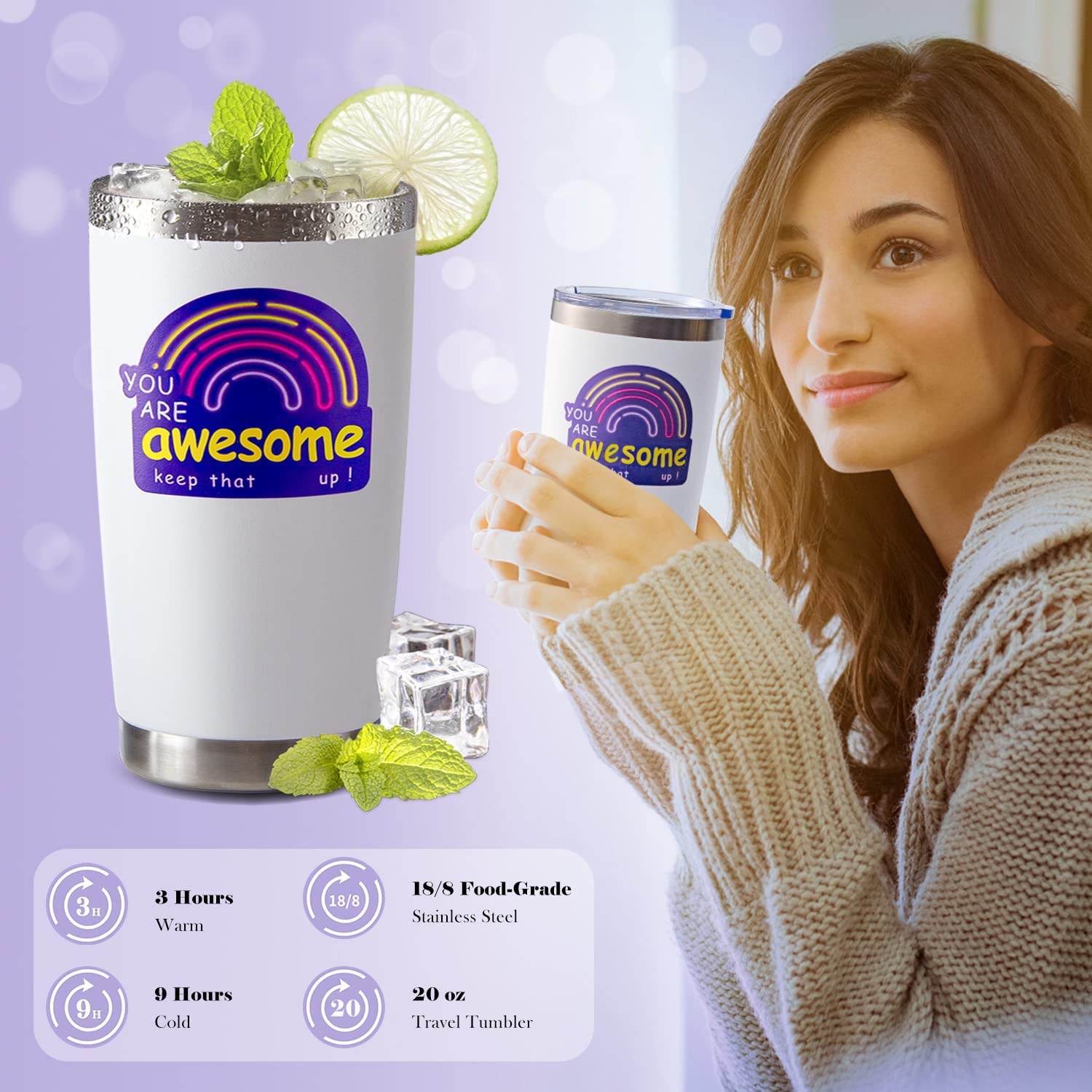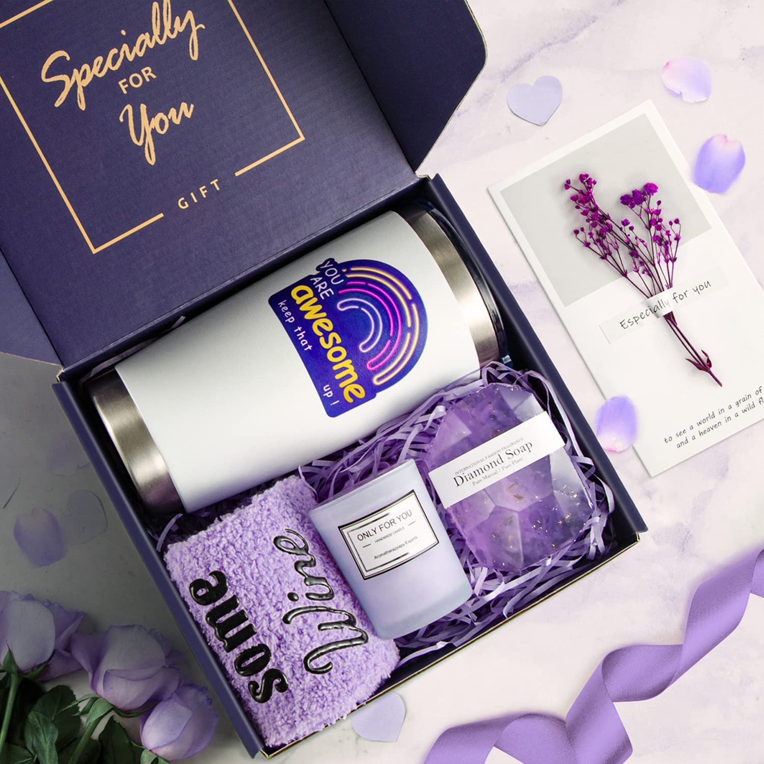 - ✨CHRISTMAS GIFTS FOR WOMEN - This women gift set includes 20oz travel tumbler, pale purple cozy socks, lavender scented candle, Diamond soap, and a greeting card for your special message, purple gift box. 20 oz insulated coffee tumbler with the words "you are awesome keep that up", inspirational words will give you power and happiness. The full set of purple will give her a different vision and feeling - perfect inspirational Christmas gifts for women