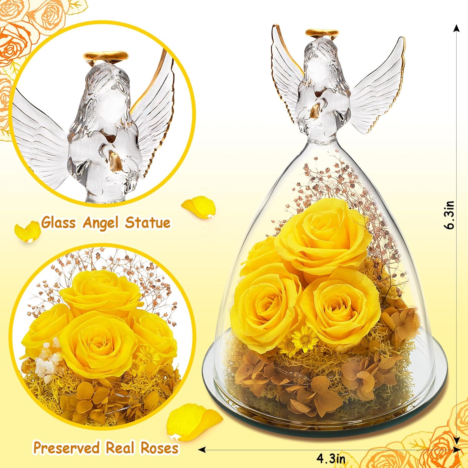 - Beautiful Rose Forever Flower Gift - Each glass angel statue is handmade and the flowers are hand-dyed, size and color may vary slightly from batch to batch. Our products come with gift boxes, gift bags, and blank greeting cards on which you can write your best wishes without having to repackage them. Embedded pearl cotton ensures the angel statue flowers will not be damaged during shipping. Glass is fragile, please keep it out of reach of children and pets.