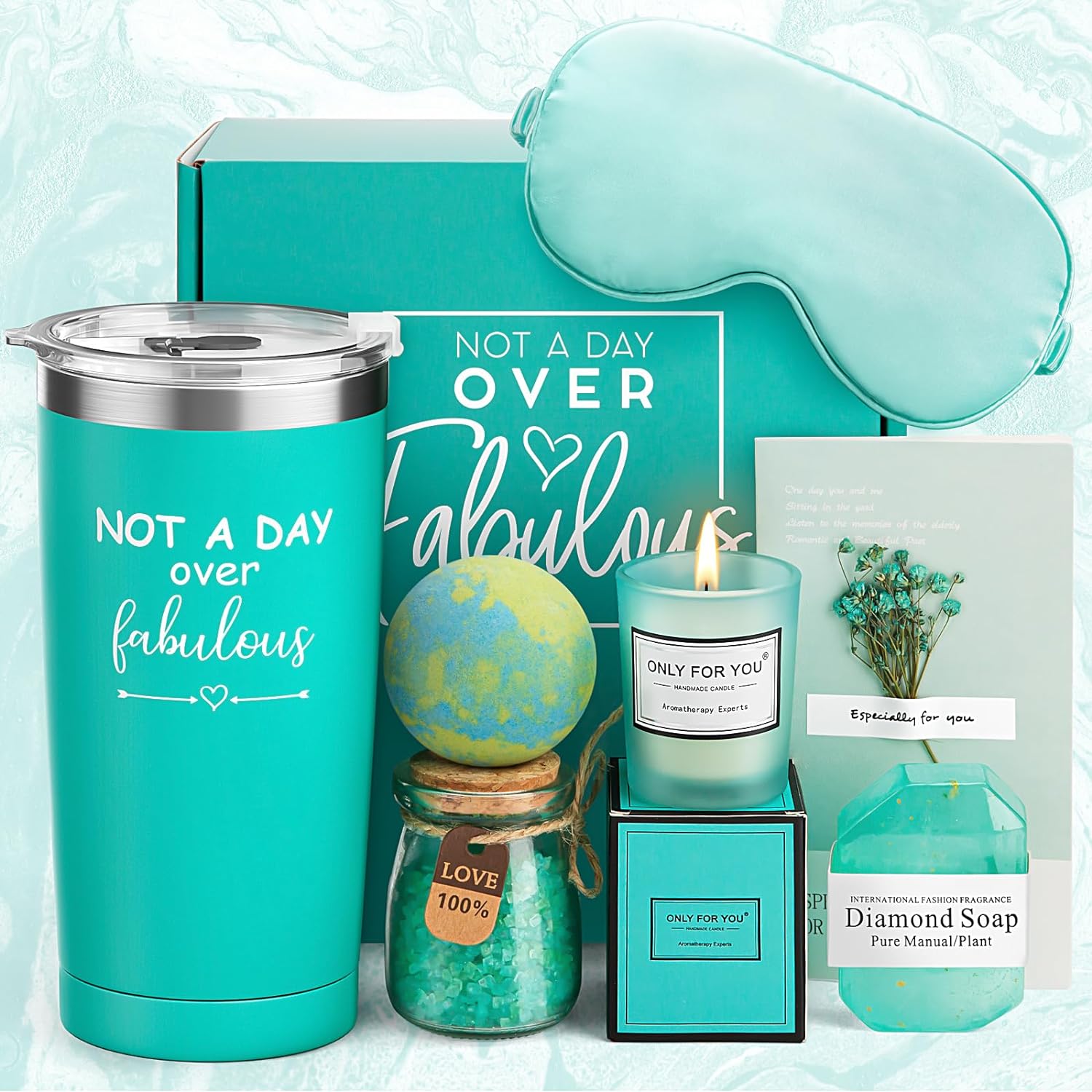 - Essential 8-Piece Gift Baskets - The perfect bday gift set contains 8pcs item, which is worth $100+. Our wine gifts for women contains one eye mask, one 20oz insulated stainless steel wine tumbler printed with the fashionable saying "Not A Day Over Fabulous", one pure diamond handmade soap, one bath bomb, one bath salt, one scented candles, a greeting card (Write your blessings) and a luxury gift box.