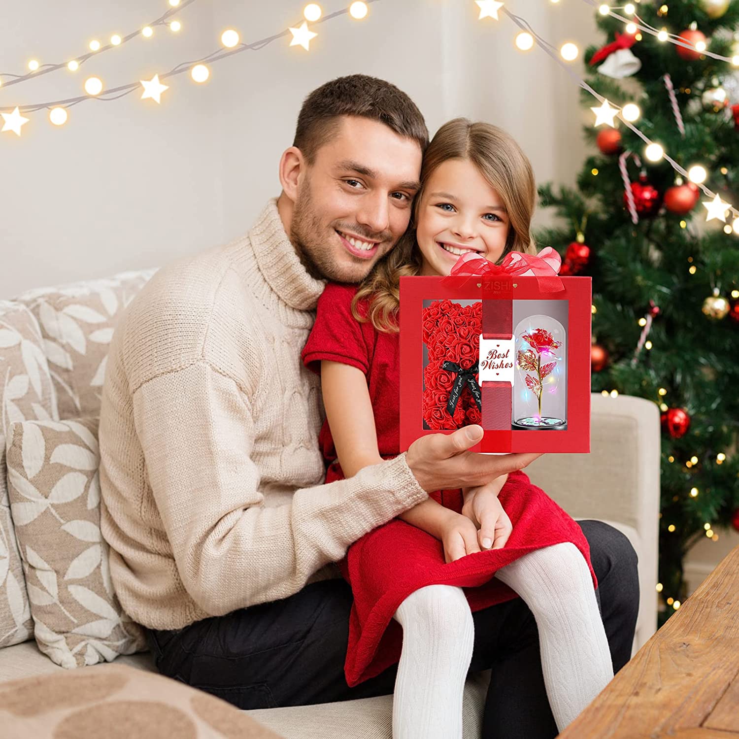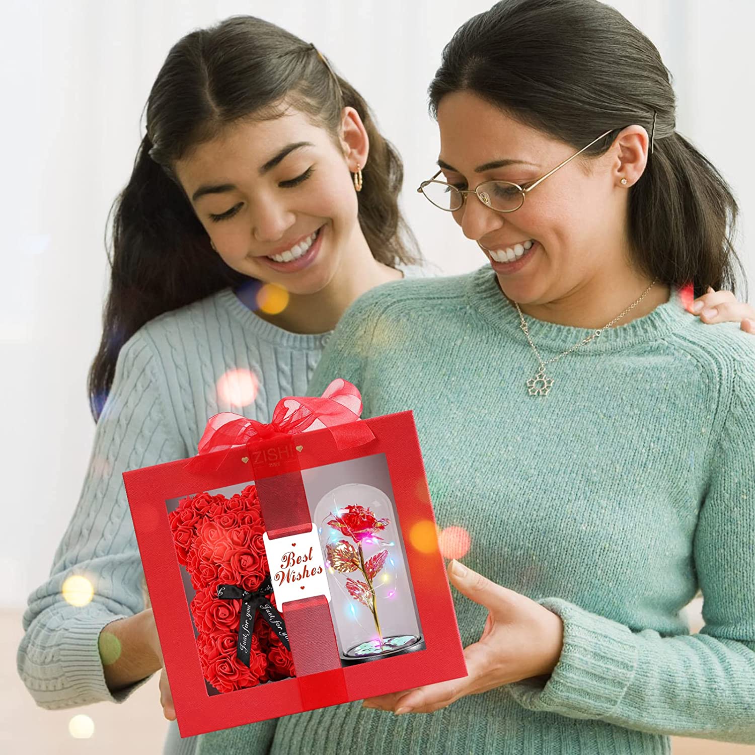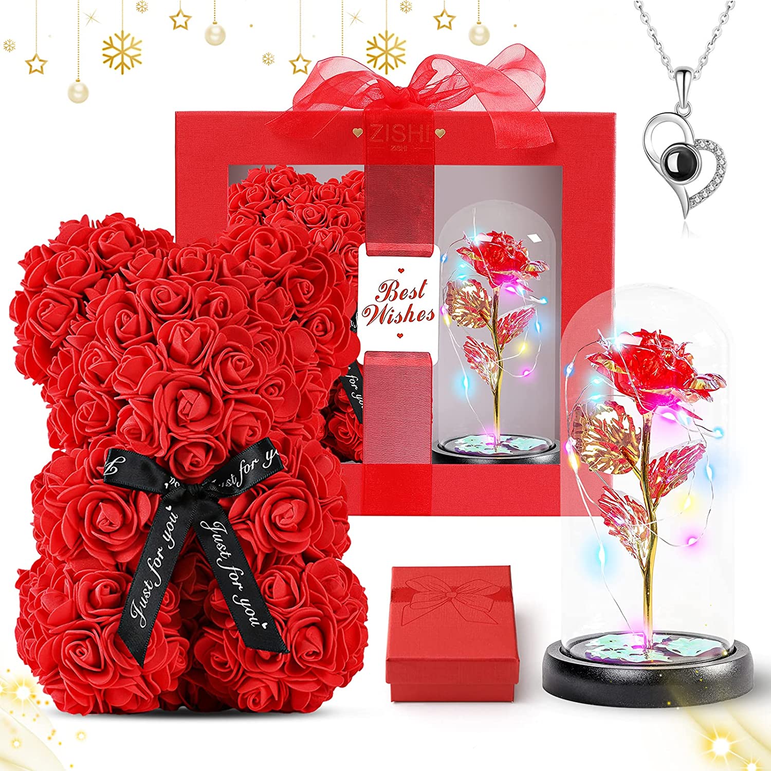 - Unbelievable gift: It is a perfect gift, It can make people feel very surprised. The rose teddy bear made by artisans is pure handmade,To the loveliest one.Colorful glass dome LED rose lamp,To the most beautiful of her,You can see the beautiful love necklace of I love you in 100 languages,Give it to your favorite women,How perfect, she will be very happy.