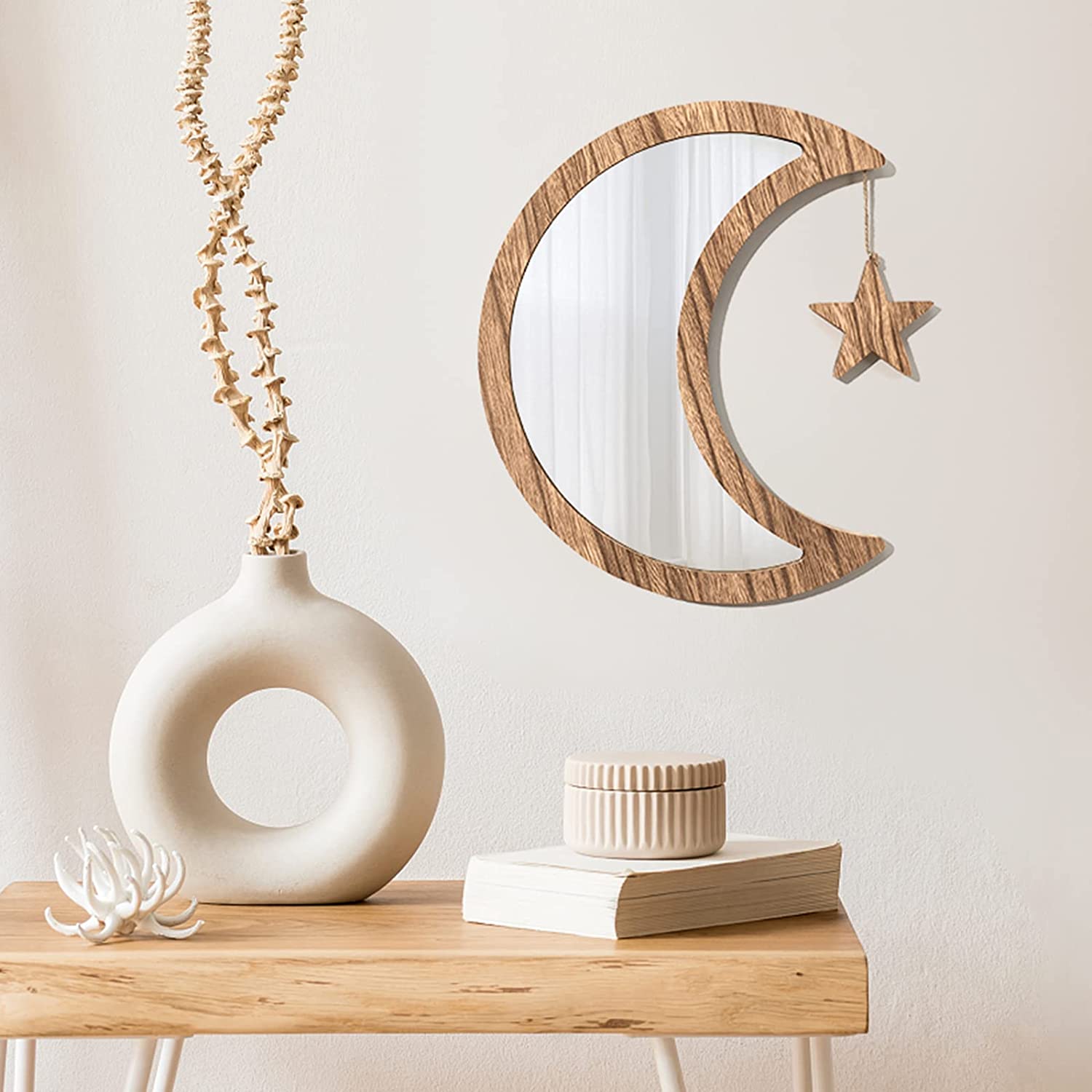 - Unique Design Crescent Moon Mirror— This aesthetic small wall mirror designed with crescent exterior, and a small wood star attched on the moon mirror,which creates a relaxed feeling in any interior, and works with more classic decor as well as colorful decor