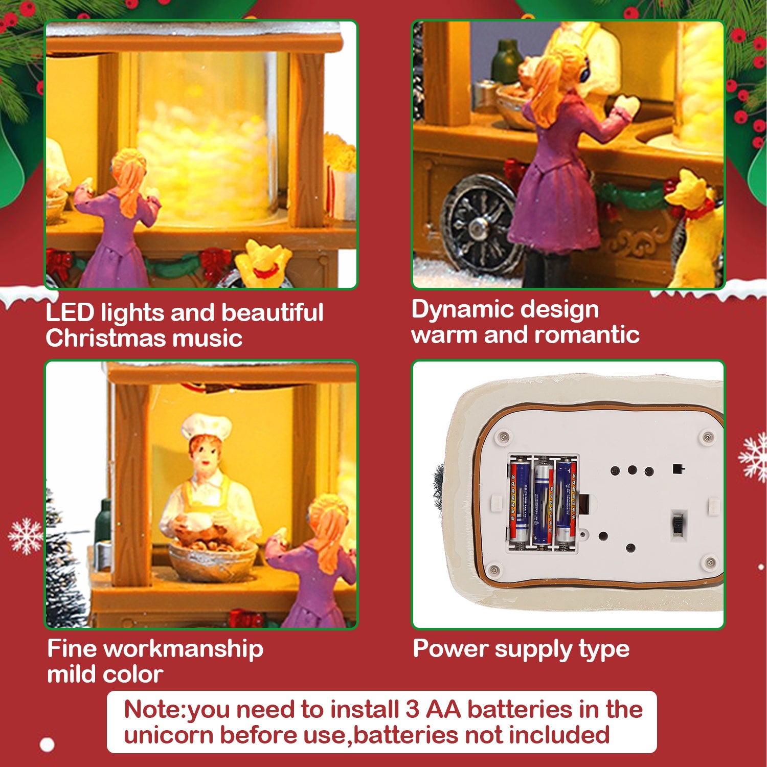 Themed Decor Enhance your Christmas decoration with this collectible building. You can place it anywhere you want and design your own Christmas village display indoor! Perfect Christmas Decoration Christmas Village is illuminated with LEDs. The colorful LED lights are beautiful and bright at night and very eye-catching as a holiday decoration. Perfect for house decoration, Christmas tree decoration. Right Christmas Gift High quality, warm, perfect holiday gift, the best Christmas decoration for children, family and friends, let them feel your strong love on Christmas and Christmas Eve! Suitable for Anywhere Christmas house decorations fit any corner of your home, entryway table, fireplace mantel, or as a dining table centerpiece, creating the perfect tabletop decoration for the holidays. Reasons for Choosing BELVITA Exquisite designs, exclusively designed by designers and handcrafted by skilled craftsmen Durable material, the whole Christmas village is made of durable resin, which can let you use it for 5-10 years Warm lights and full of festive music, make your Christmas more fun and make your family happy Excellent after-sales service,any questions, we will give you an answer in the shortest possible time *- 100% RESIN: This Animated Christmas Village Popcorn House with durable resin materials and will decorate your home for seasons to come! Enhance your Christmas Decorations with this amazing Lighted Christmas House figure. *- HAND-CRAFTED: We are proud to say that this Pre Lit Christmas Village is meticulously hand-crafted and intricately hand-painted from skilled artisans. *- CHRISTMAS VILLAGE : Christmas Village popcorn house, a girl with her dog waiting for hot popcorn on Christmas Eve, the store's lights warmly illuminate them and will be the finishing touch to your Christmas Village collection! *- PRODUCT HIGHLIGHTS : Christmas Village collection has warm LED lights and 8 Christmas music tracks, and there are two modes to choose from, you can turn on the music and lights together for a more intense Christmas atmosphere, or you can just turn on the lights and turn off the music so you won't disturb your family in the middle of the night. *- PERFECT CHRISTMAS GIFT:This exquisite Christmas village will be the perfect gift, collectibles, table decorations, and it will definitely add more joyful atmosphere to Christmas. As a Christmas gift to family, friends or kids, it will definitely surprise them *- WORTH HAVING: Included with 1* popcorn house requires 3*AA batteries(not included), comes packaged in protective foam inside.