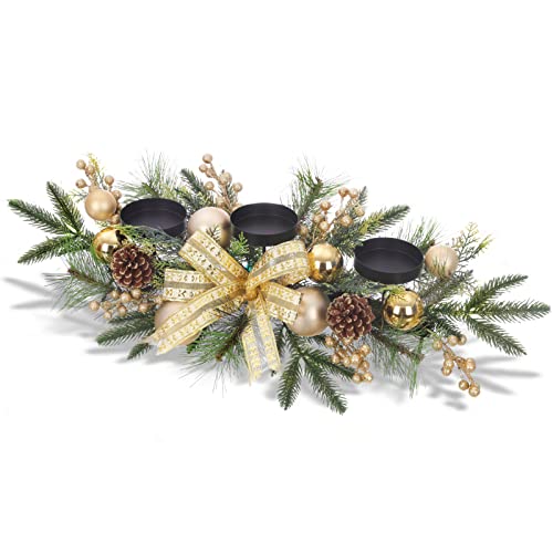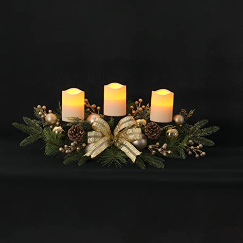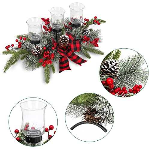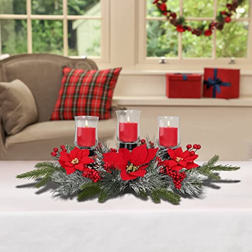 - 【Rich Ornaments】This Christmas centerpieces with a textbook pairing of rich mixed faux poinsettias, snowy pine cones, red berries, pine needles and cedar branches. They create a realistic look and remains fresh year after year and season after season. The metal base is nestled in natural twig, and come with 3 glass hurricane shade candle holders.