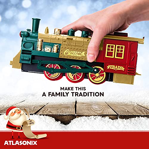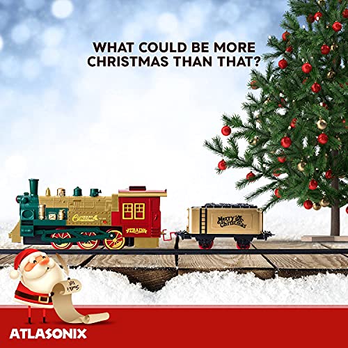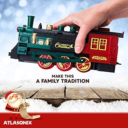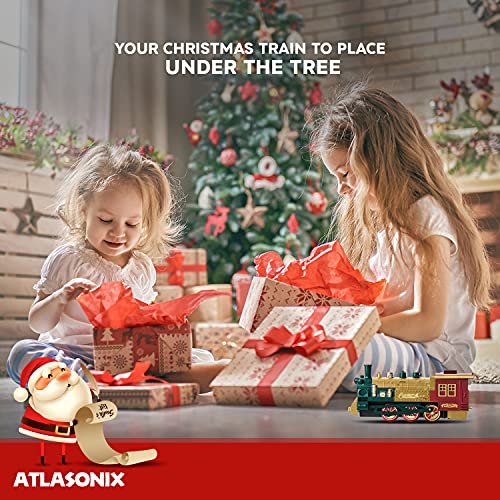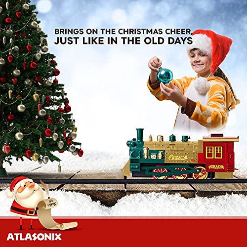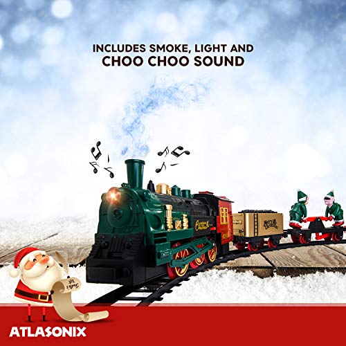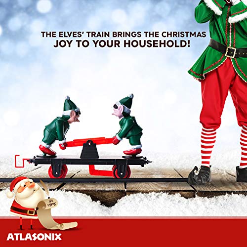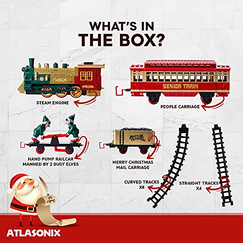 - 🎄EVERY CHRISTMAS TREE DESERVES A TRAIN SET - Atlasonix brings you a Christmas Tree Train Set Deluxe! Smoke, lights, the tooting horn, steam engine, train cars and the hand operated rail car with 2 of Santa’s Elves - what could be more Christmas than that?