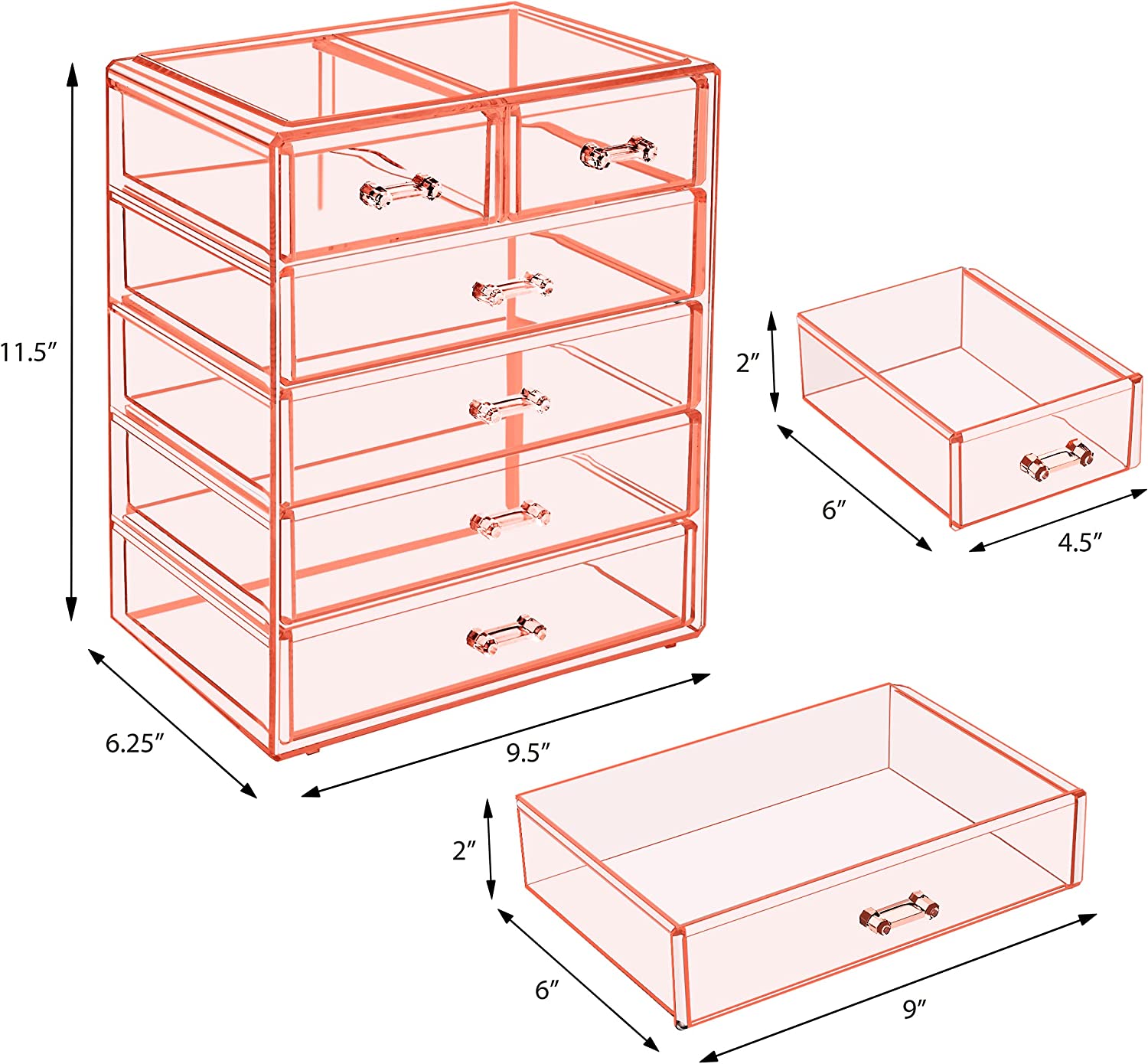 Clear Cosmetics Makeup Organizer-Big & Spacious Acrylic (4 Large, 2 Small Drawer) Pink