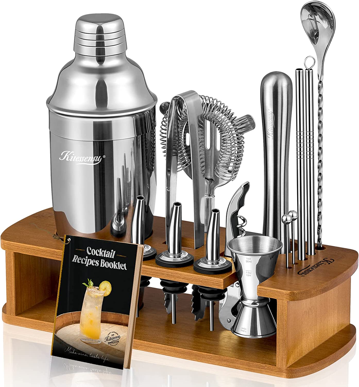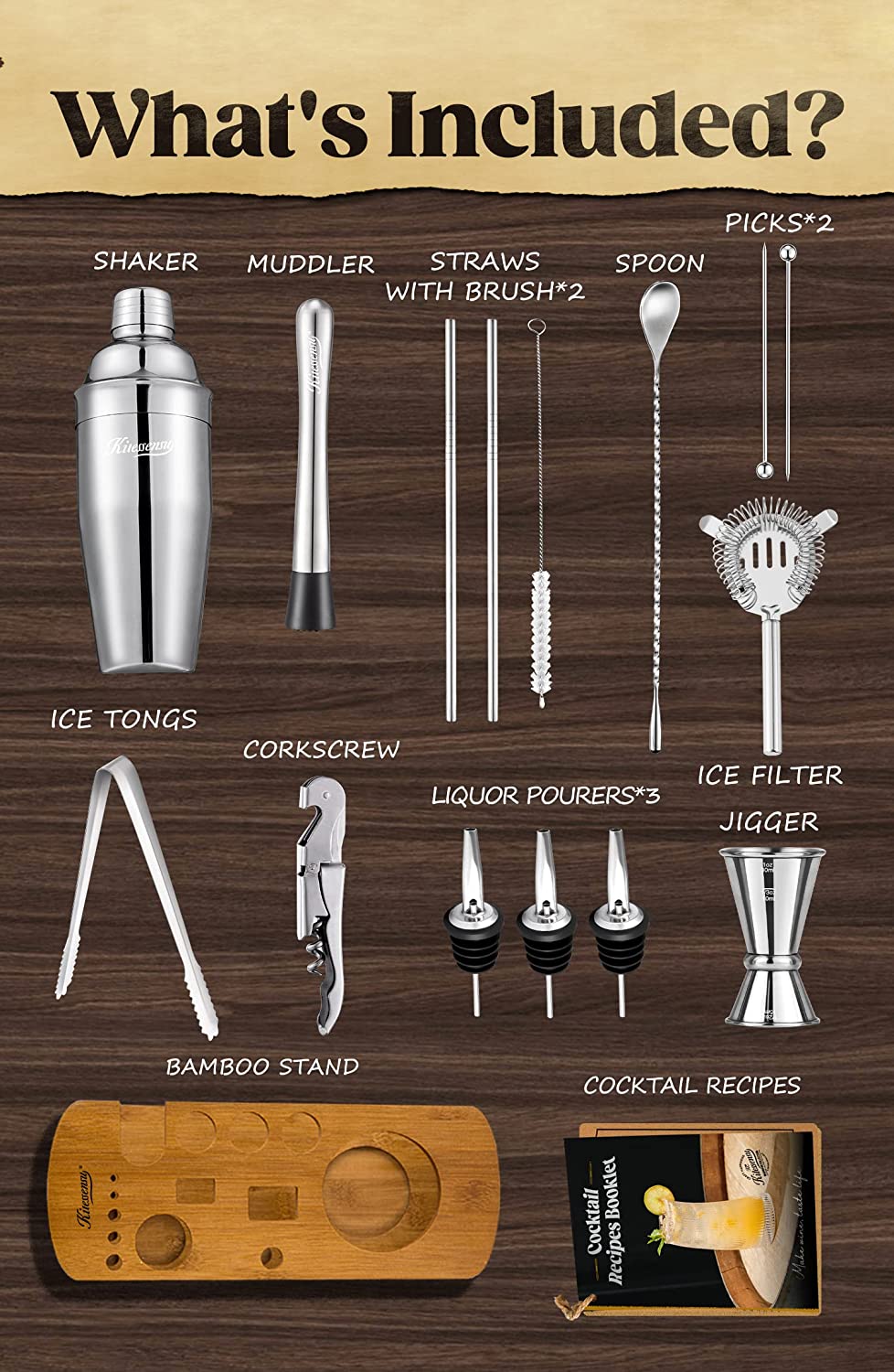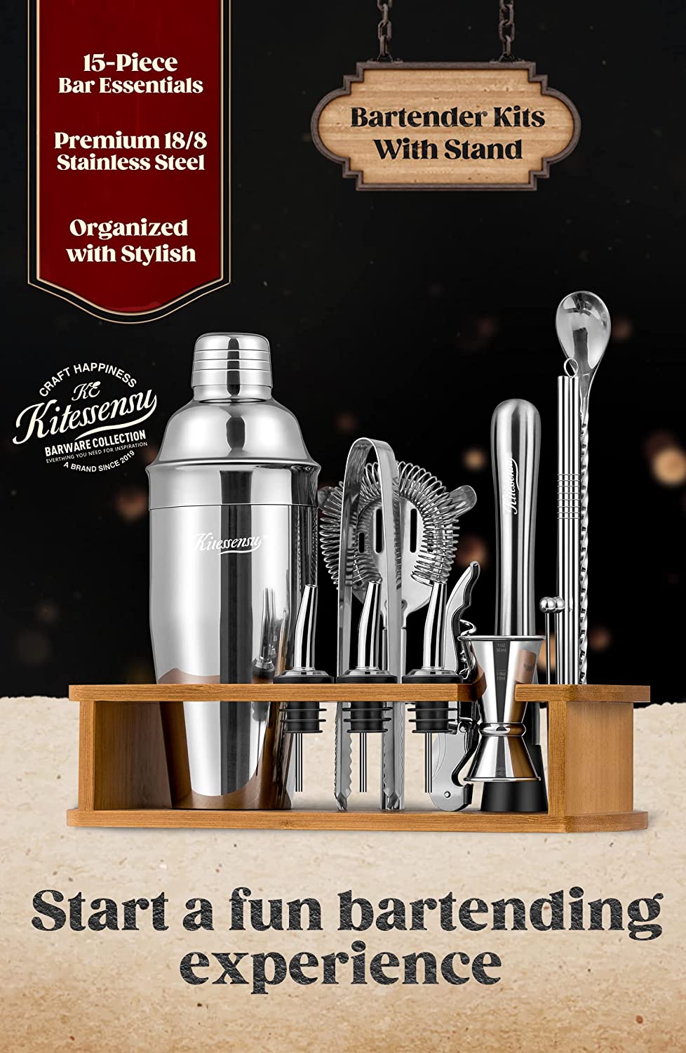- Made to Last: Upgraded 18/8 stainless steel bartender kit cocktail set is your best bet, which is specially thickened (0.8 mm) to protect itself from rust for lifetime and remain shiny and new after years of shaking, and it can withstand lots of rough and tumble, even being dropped, without letting you down. and the bar mixing set is safe in the dishwasher