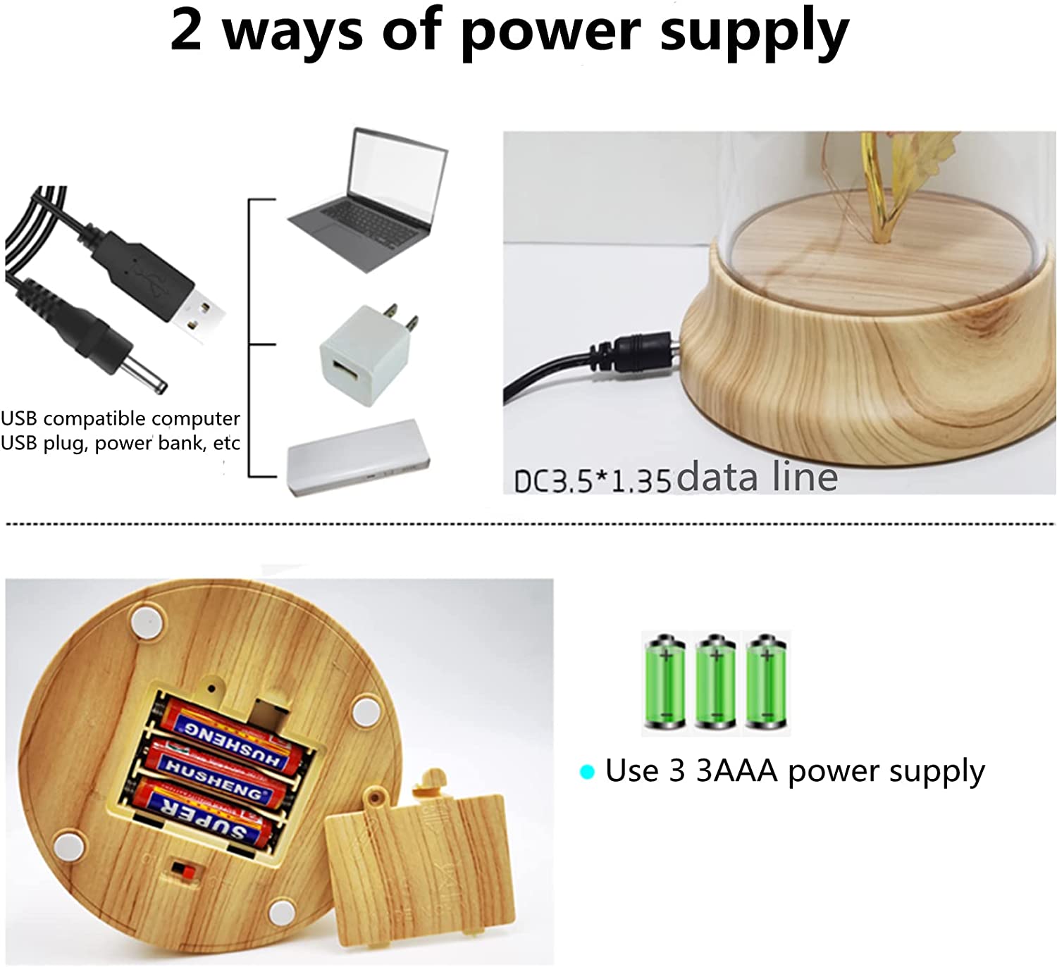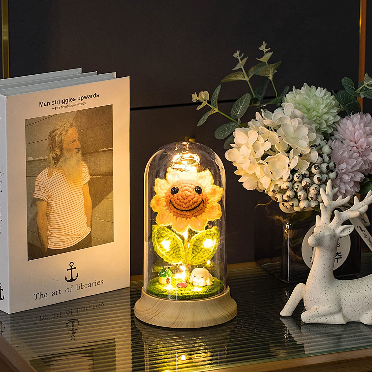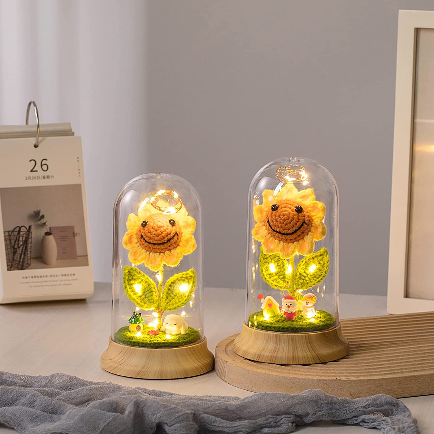 - 2. 【Material and Design】 Drop-resistant acrylic transparent cover, environmentally friendly ABS wood grain base, high-quality wool crochet smiley sunflower, all-copper LED 2m light string, the light string has a service life of 3 to 5 years, USB power and battery 2 kinds of use functions, you can choose any one