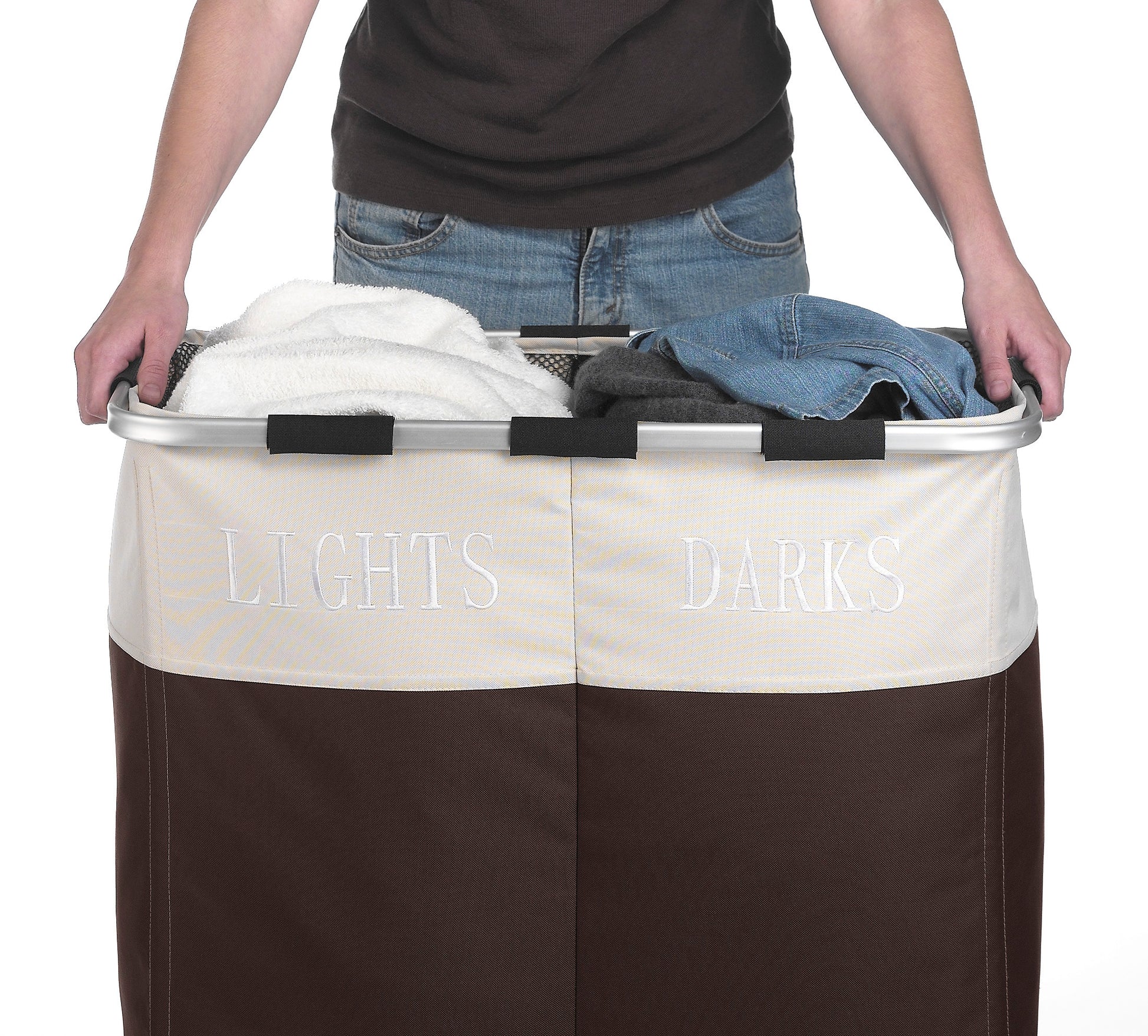 Laundry hamper has an external lightweight aluminum frame rim with interior tent poles creating a sturdy laundry system. The heavy-duty polyester exterior with laminated vinyl interior makes cleaning easy and the mesh top with an adjustable drawstring closure maximizes capacity. Perfect for laundry room, bedroom closet, or dorm room. Assembled Dimensions: 13.5 L x 13.5 W x 21.25 H inches. Is a 4th generation family-owned and operated business. Double Laundry Hamper: *- Sort lights and darks as you go, making laundry day that much easier *- Mesh drawstring top keeps laundry in place; built-in handles for easy transport *- Dual compartments separate darks from lights or gym clothes from delicates *- Assembled Dimensions: 12.5 L x 24.75 W x 21.5 H inches *- Easy assembly with no tools required *- Constructed of durable yet lightweight materials so that it remains easy to transport even when full *- Collapses easily for storage when not in use *