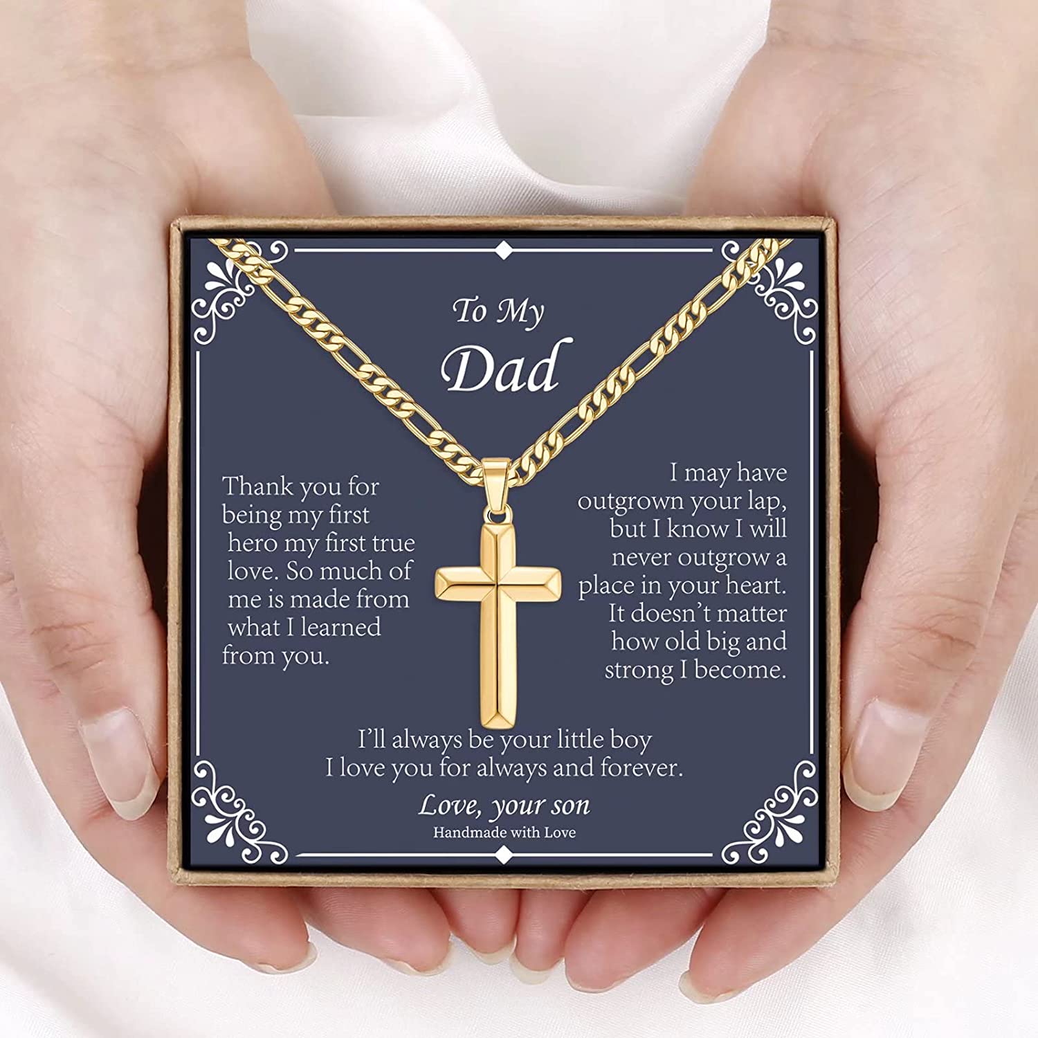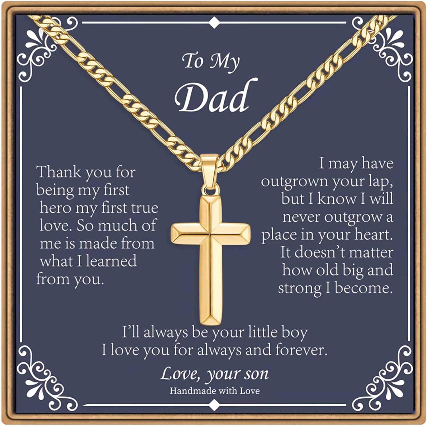 - DAD GIFTS FROM SON: If you are looking for a gift for your dad, this cross necklace is a great choice. The cross necklace comes with an box, a gift bag, an envelope, a thank you card, and a special card. It's ready to give your dad as a gift. Show your dad in your life how much he means to you with the cross necklace and heartfelt message card.