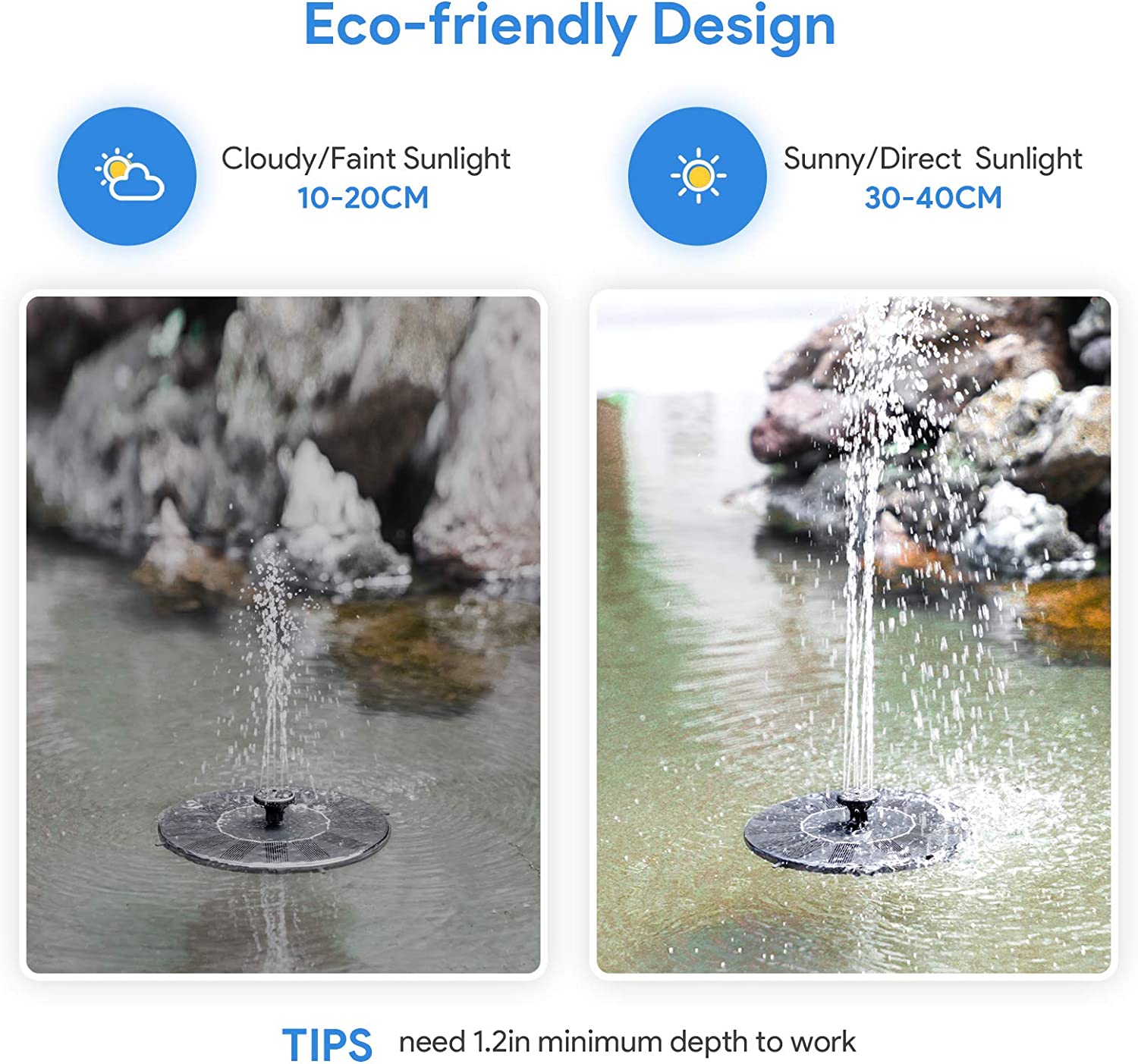 - Eco-friendly Design: Spring is in the air. Do you want to attract a lot of hummingbirds to your backyard? Powered by sunlight, the 1W solar fountain does not need any electricity or battery. It runs automatically in 3 seconds when sunlight is sufficient, with a spray height of 30-40cm. A wonderful addition to your garden!