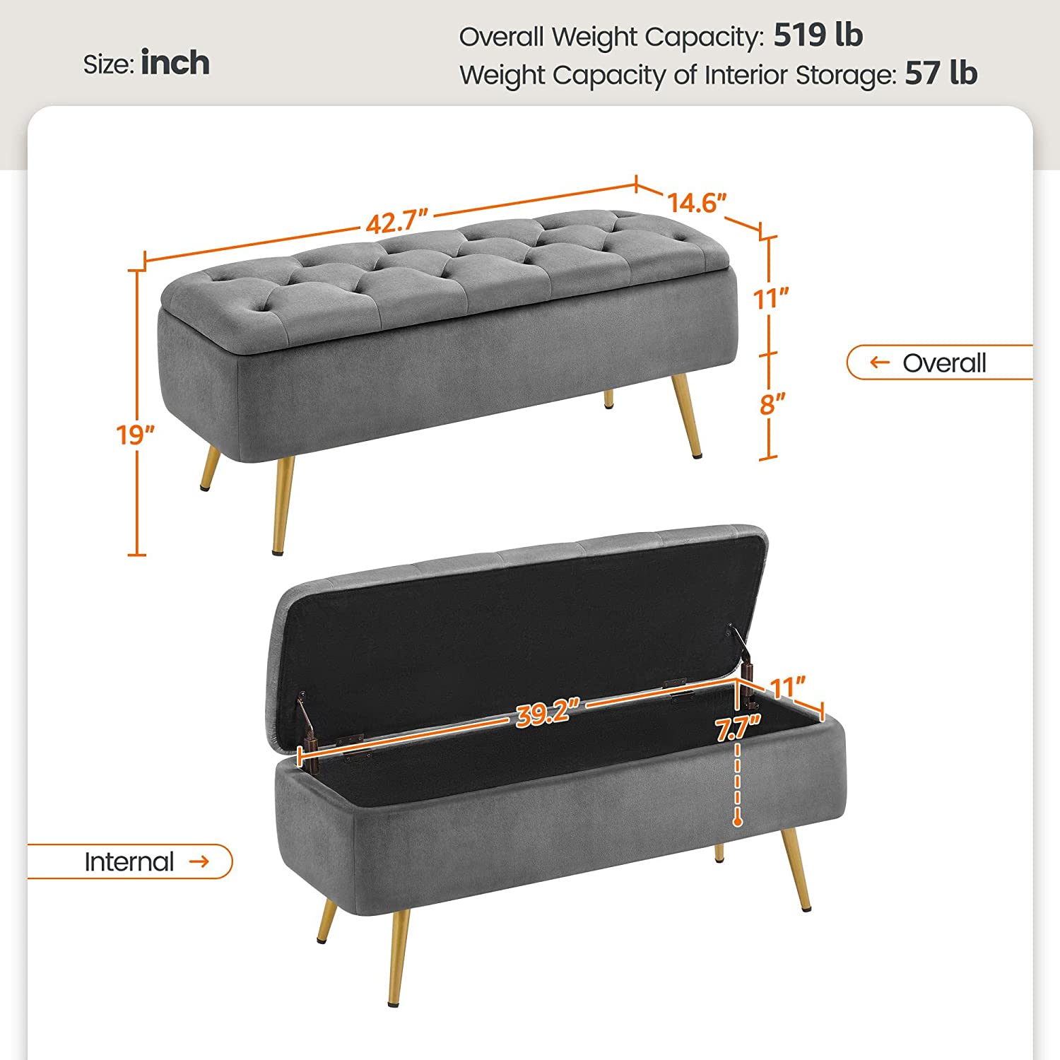 - Specifications: Materials: Polyester, Metal, foam; Colour: Grey; Overall Dimensions: 42.7″ L × 14.6″ W× 19″ H; Storage Space: 39.2″ L × 11″ W × 7.7″ D; Overall Weight Capacity: 519 lb; Shipping Weight: 31.5 lb; Item Weight: 26.4 lb