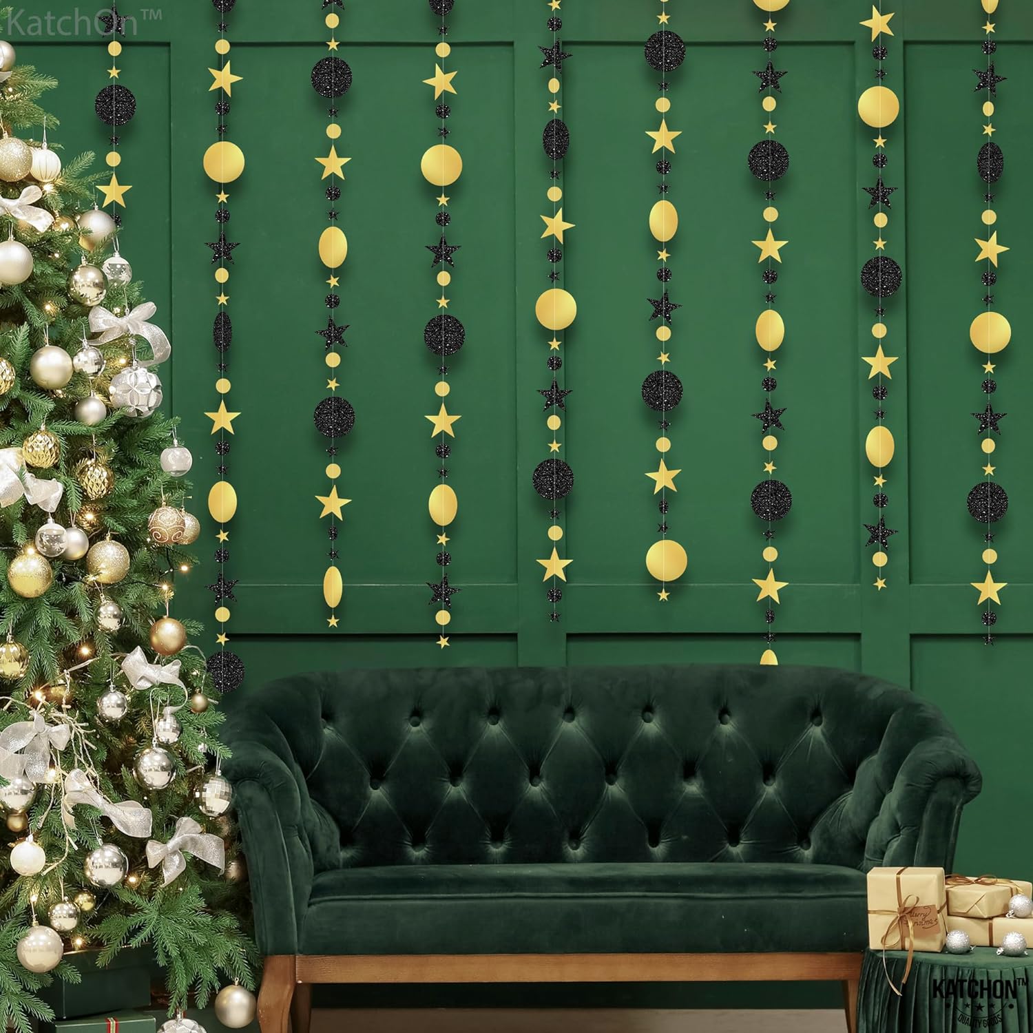 - NO DIY REQUIRED - PRE-STRUNG | EASY-TO-HANG : This luxurious glitter 2024 New years eve party supplies can help you save your time and effort. Delivered pre-stung and preassembled, this black and gold new year star and moon garland is hassle-free and very easy to install. Just hang on wall or in any corner of your home or office. Great new years eve banner 2024 at entrance way or as a complement for new years eve backdrop of your new years eve party supplies 2024.