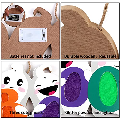 - Packaging Include:You will get a door hanger containing three cute ghosts. These cartoon ghosts that can light up hold the “BOO”sign.The Halloween door decor is packed in thick carton,need self-equipped batteries