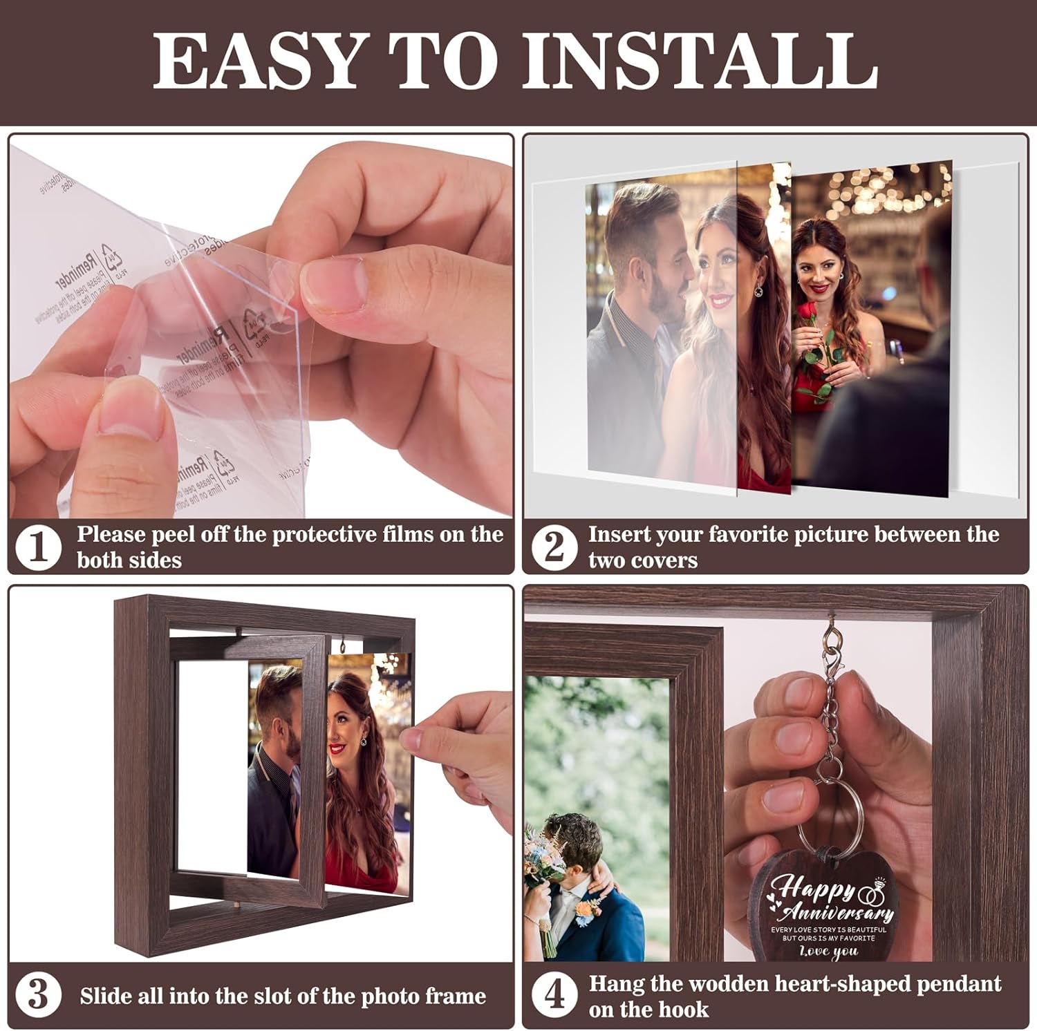 - DOUBLE SIDED DESIGN: Unlike traditional photo frames, this anniversary picture frame boasts a 360 degrees rotation feature, enabling you to showcase two photos simultaneously. With a heart-shaped pendant engraved with touching words "Happy Anniversary. Every love story is beautiful, but ours is my favorite. Love you forever", makes it a meaningful gifts for Valentine's Day or wedding engagement.