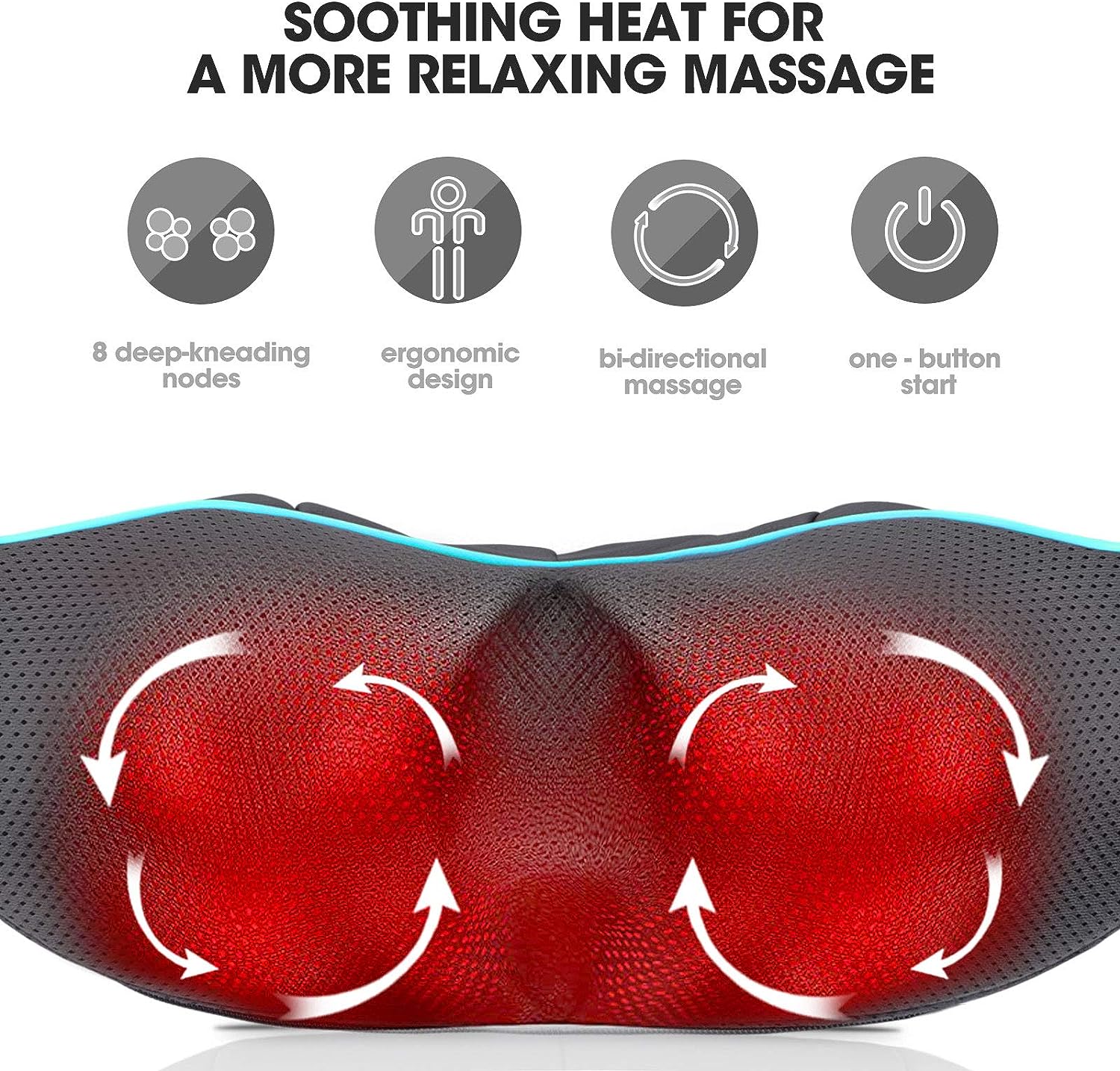 - HEATING FUNCTION & ADJUSTABLE INTENSITY - This neck massager pad has 3 speed strength levels, which allow you to get the right and appropriate amount of pressure to relieve your muscle pain. The heating function with the back massager further massage fatigued muscles and reduce stress. Overheating protection and 15 minutes auto shut-off function guarantee you a safe massage journey. It can also be turned off manually