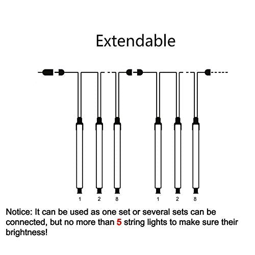 - 【Romantic Meteor Shower Lights】Led falling rain drop lights, the light of every bulb turns on and out one by one in sequence and quickly just like meteor shower or falling snow in the night sky, very beautiful. These icicle string lights can be used as one or be connected (The best effect is to connect 3-4 strings). If the whole light with 8 tubes can't come light when you connect many sets, pls check the female and male connectors are linked correctly.