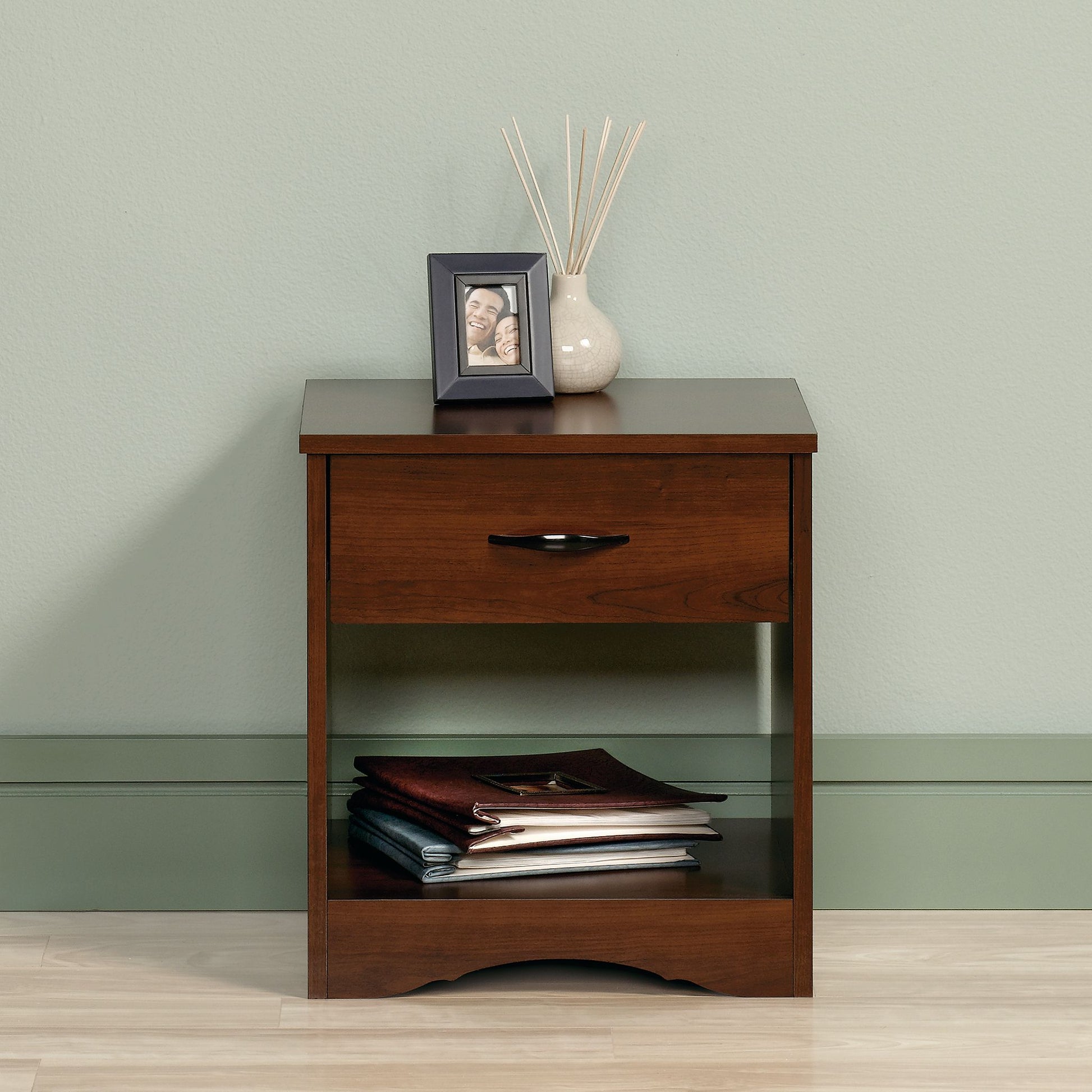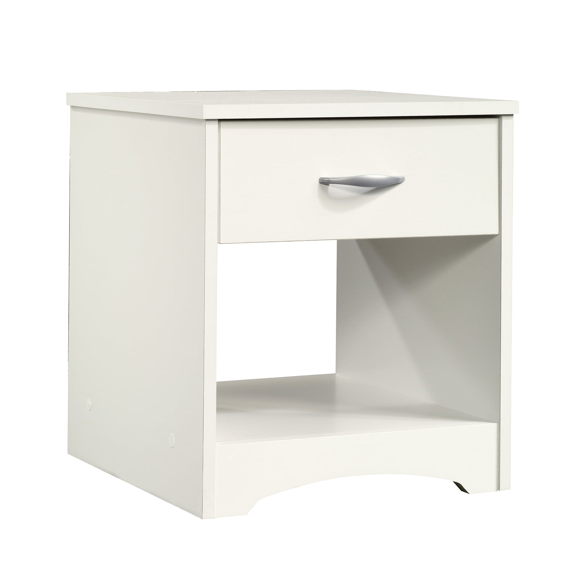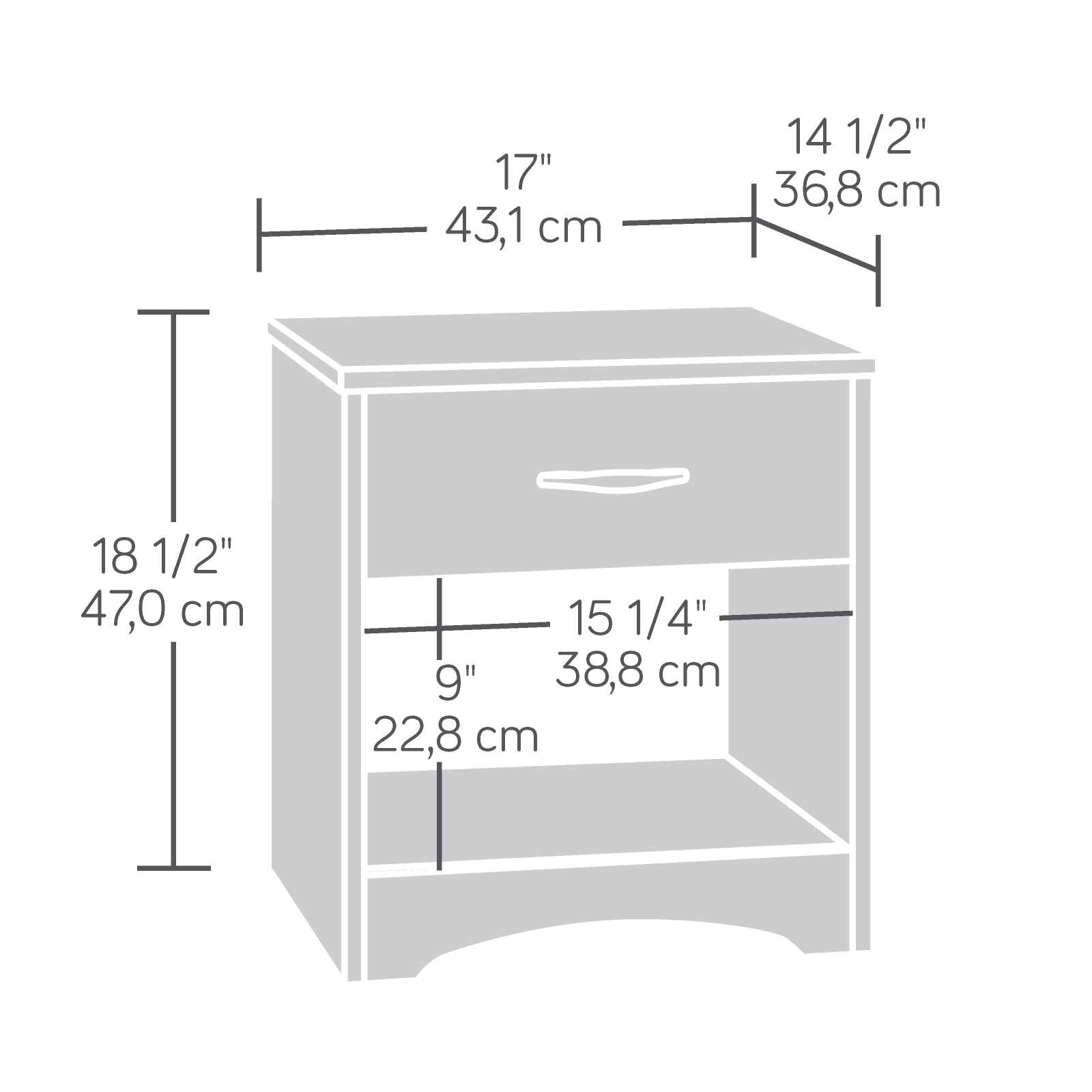Looking to add some stylish bedside storage to your home? Check out these nightstands. It features one drawer that opens and closes on smooth metal runners, ideal for storing your favorite nighttime book, reading glasses, and the TV remote. Find even more storage on the lower open shelf, a great place to display books, photos, collectibles, and more. Available in Soft White and Brook Cherry finishes, this bedside table will put that finishing touch on your bedroom decor and help you contain the clutter. Sauder Beginnings Night Stand Features: Easy-glide drawer with safety stops. An Open shelf provides additional storage. We hope you like what you see. Sauder designers travel the world and bring back the best and latest in style, finish, and color trends. This inspiring world travel is evident in the cutting-edge and innovative furniture solutions we offer to you! *- Engineered wood construction *- Sauder Beginnings Night Stand assembled dimensions: 17.1" L x 14.7" W x 18.6" H *- Assembly required