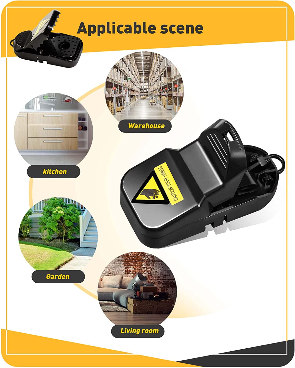 - ApplicationsOur trap has the unique capability to catch both mice and small sized rats, suitable for both indoor and outdoor use, such as kitchen, living room, bathroom, warehouse, garden, garage etc. Please keep away from pets, children and other small animals outdoors when using it.