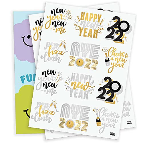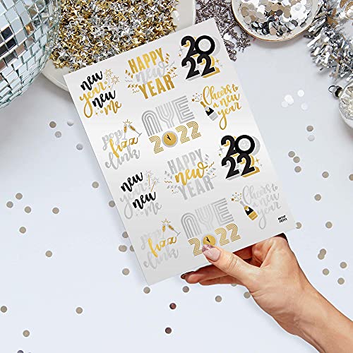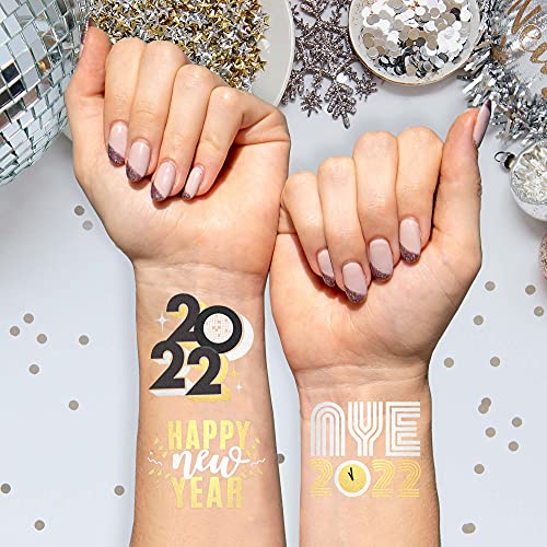 - ✨Holiday Tattoos For The Whole Party: two sheets with a total of 24 black + metallic tattoos featuring hand drawn designs that guests will love! Sayings include: Cheers to a New Year, New Year New Me, Happy New Year, 2022 + more!