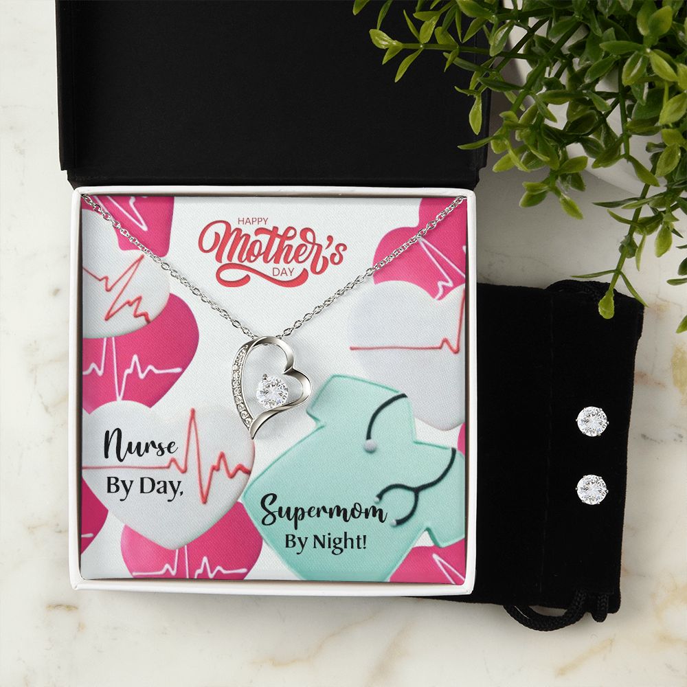 Nurse by Dad Happy Mothers Day mom Forever Love Necklace and Cubic Zirconia Earring Set