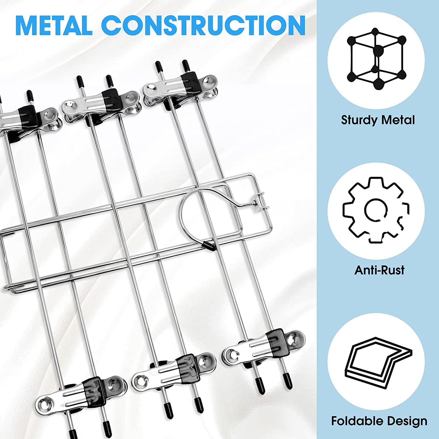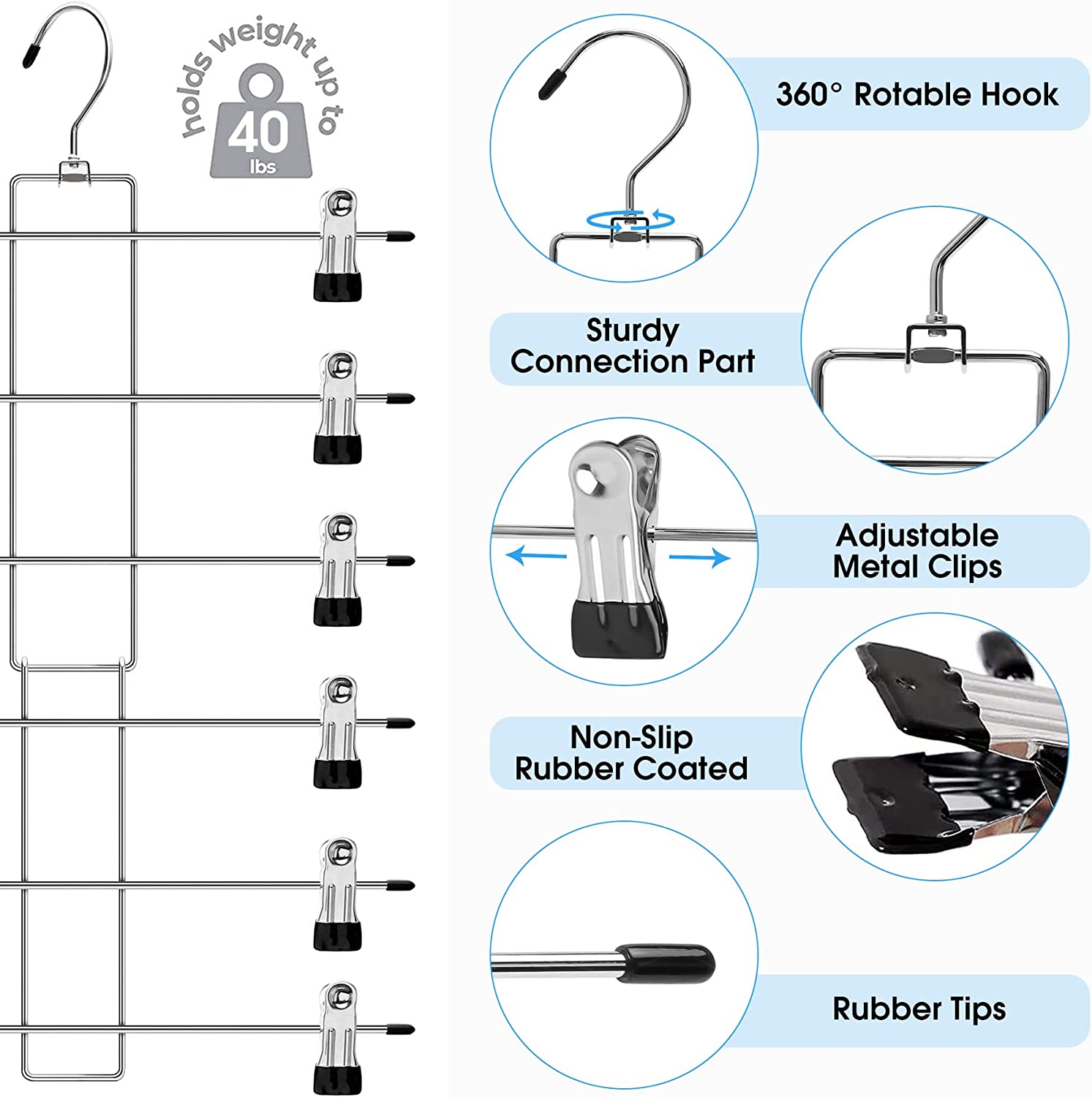 - Closet Storage Clothes Organizer with Adjustable Clips: This closet storage scarf hanger includes 6 pairs of metal clips which easily slide along the bar to adjust to fit clothing of all sizes, perfect for men's, women's, and children's clothing, these strong metal clips with a rubber coating protect your clothing from creases and won’t fall off. Also, all edges of the clothes hangers have rubber tips to prevent damage to the clothes