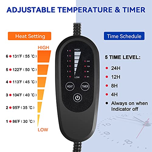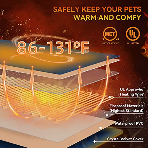 - [ Adjustable & All-Round Heating ] - You can easily decide length of heating time by adjusting the timer, anywhere from 4 to 24 hours and temperature ranged from 80 to 131℉. The intensive heat wires (UL Approved) neatly distributed in pad provide all-round and in-time warmth for your pets.